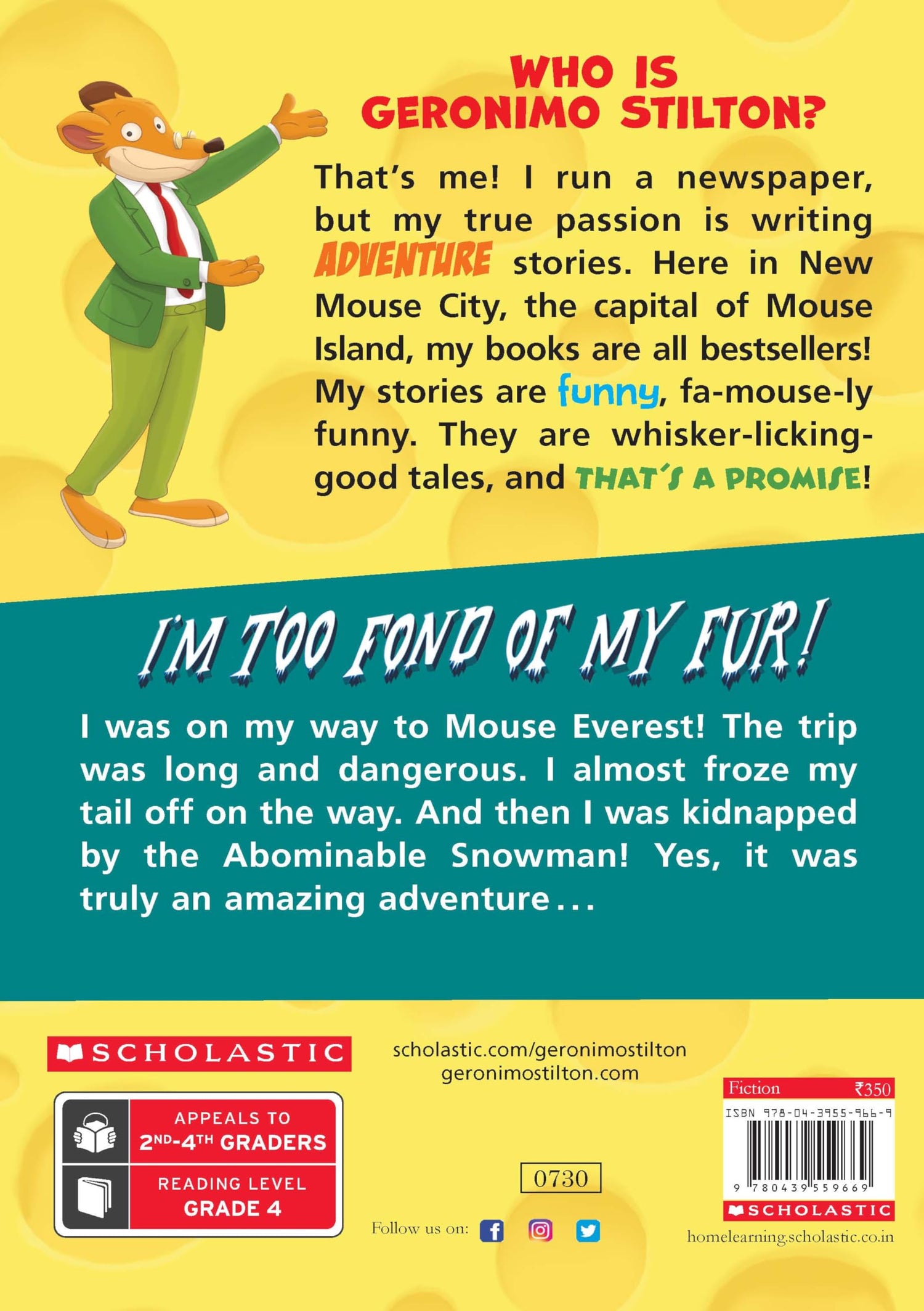 জেরোনিমো স্টিলটন কে? আমি তো! আমি একটা সংবাদপত্র চালাই কিন্তু আমার আসল নেশা হলো অ্যাডভেঞ্চারের গল্প লেখা। এখানেই মাউস আইল্যান্ডের রাজধানী নিউ মাউস সিটি। আমার বইগুলো সব বেস্টসেলার!! আমার গল্পগুলো সুইস পনিরের চেয়েও মজাদার এবং অতিরিক্ত ধারালো চেডারের চেয়েও বেশি টক। এগুলো ঝাঁঝালো ভালো গল্প এবং এটা একটা প্রতিশ্রুতি!