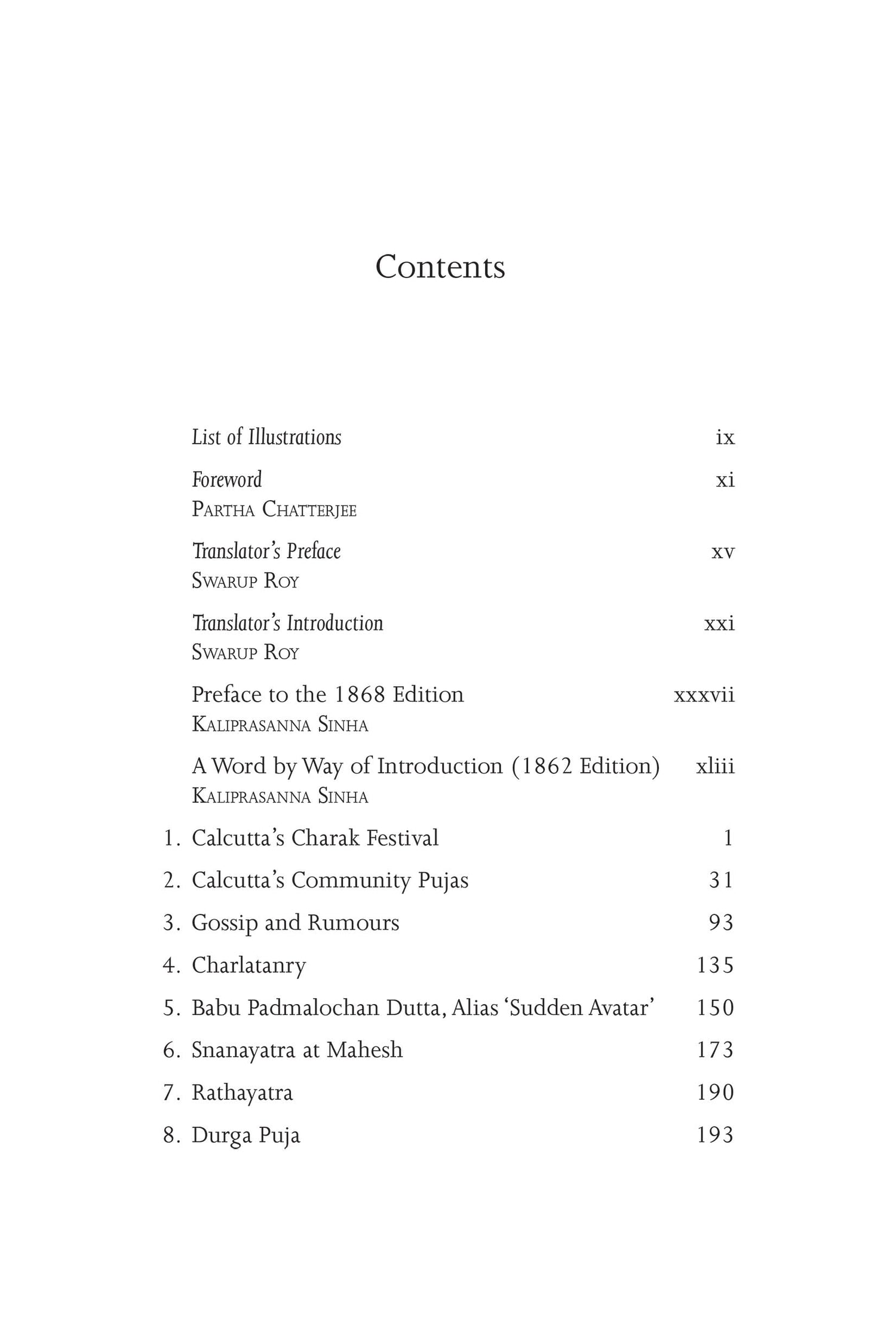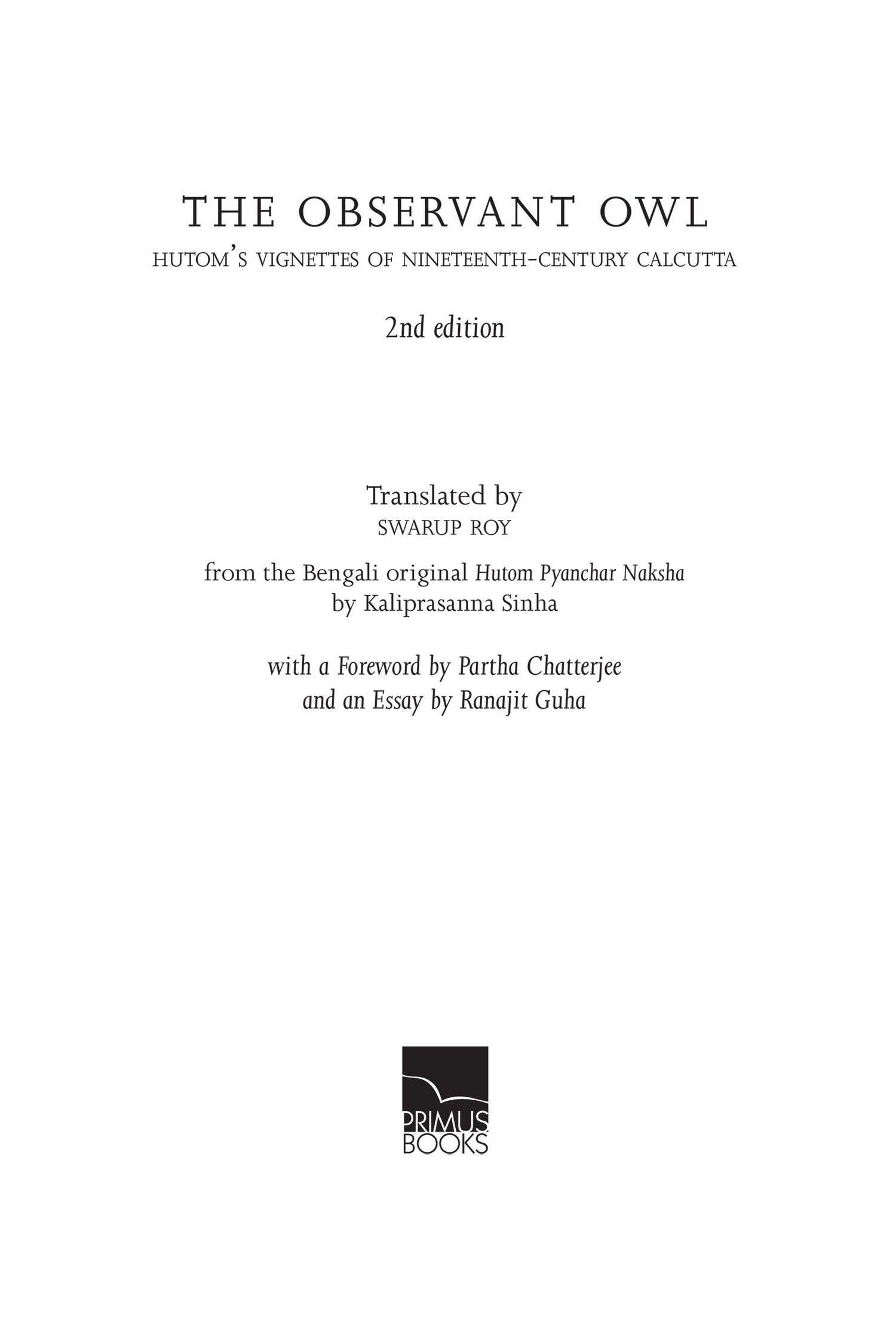 The Observant Owl, originally published in 2008, is the first ever English translation of Kaliprasanna's work. It presents a joyously irreverent portrait of the city he lived in. The writing is so vivid that one finds within these pages a sense of walking through a nineteenth-century city as fishwives call out their wares, housewives hurry to the river for baths, thieves pick pockets, and carriages creak through slush and rotting banana peels, carting passengers high on ganja.