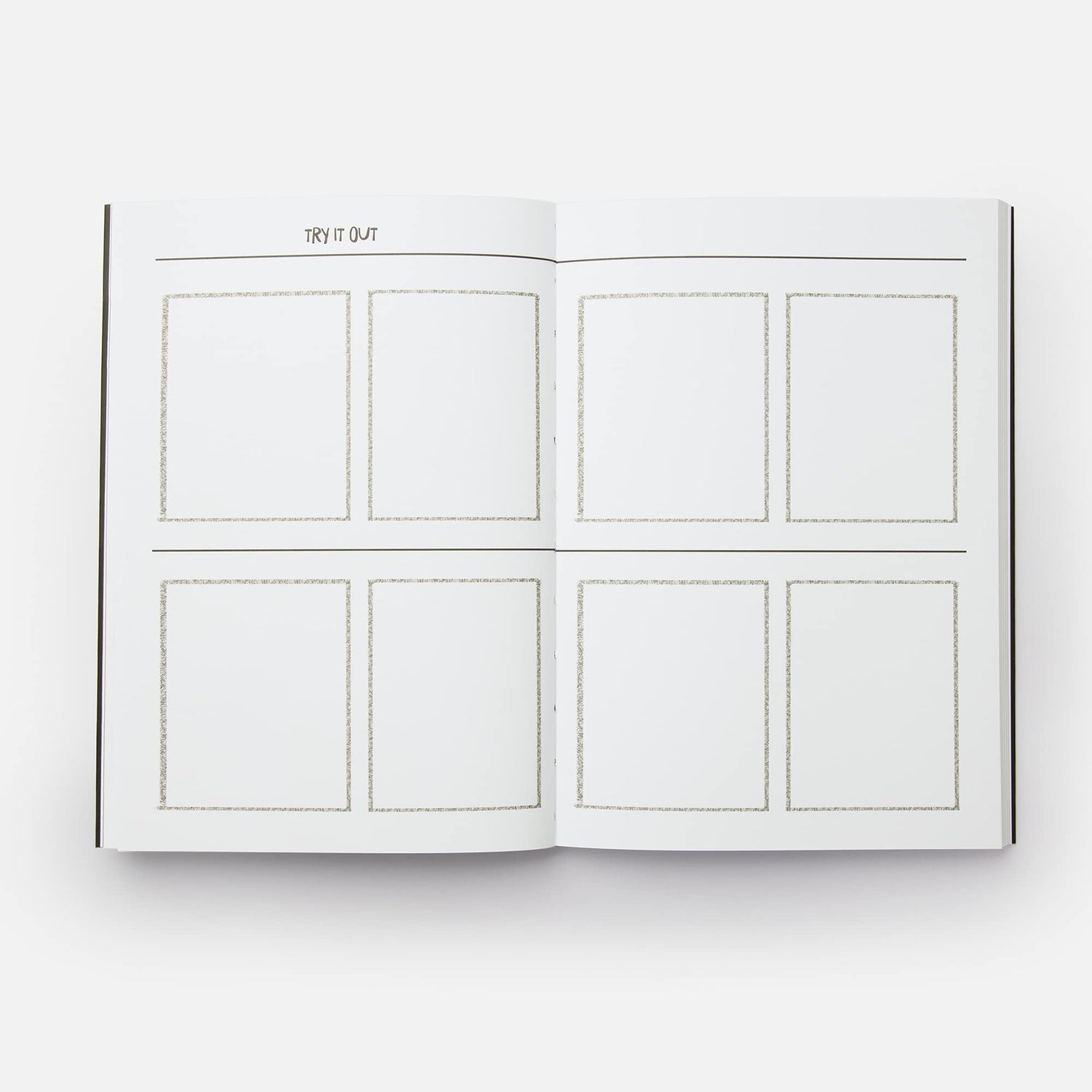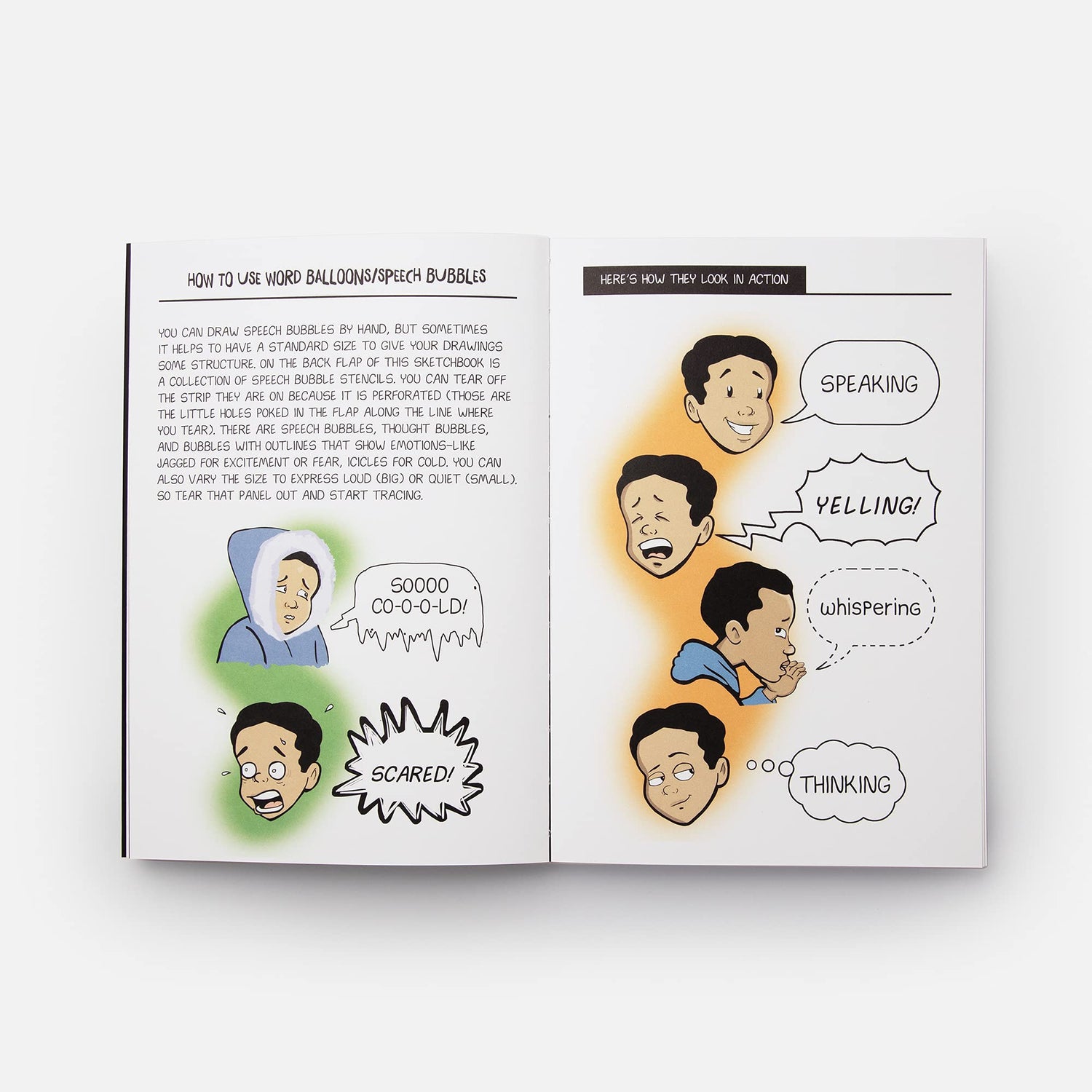 Because drawing panels and speech bubbles by hand can get wobbly, there’s a ruler you can tear off in the front to make straight lines, and some speech bubble stencils on a panel in the back that you can tear off and trace onto your cartoons.