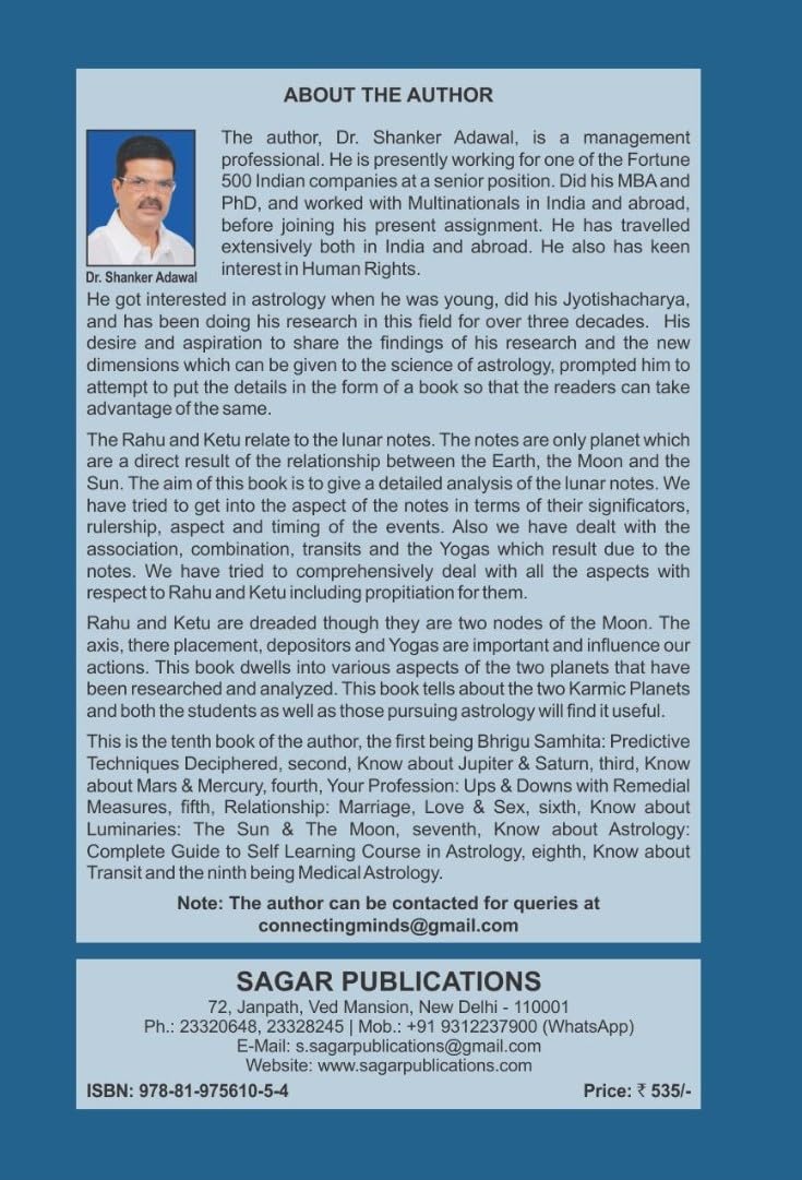এই বইটিতে চন্দ্র নোড, রাহু এবং কেতু সম্পর্কে আলোচনা করা হয়েছে, যা পৃথিবী, চন্দ্র এবং সূর্যের মধ্যে মিথস্ক্রিয়ার ফলাফল। এই নোডগুলি, যদিও গ্রহ নয়, আমাদের কর্মের উপর উল্লেখযোগ্য প্রভাব ফেলে। এই বিস্তৃত বিশ্লেষণে তাৎপর্য, শাসন, দিক, ঘটনার সময় এবং তাদের প্রভাব সম্পর্কে আলোচনা করা হয়েছে। লেখক রাহু এবং কেতুর ফলে সৃষ্ট সংযোগ, সংমিশ্রণ, গোচর এবং যোগ সম্পর্কেও আলোচনা করেছেন। এই কর্ম গ্রহগুলির গভীর অধ্যয়নের মাধ্যমে, বইটি জ্যোতিষশাস্ত্রের ছাত্র এবং অনুশীলনকারীদের জন্য একটি অমূল্য সম্পদ, যা প্রায়শ্চিত্ত এবং প্রতিকার সম্পর্কে তাত্ত্বিক অন্তর্দৃষ্টি এবং ব্যবহারিক নির্দেশনা উভয়ই প্রদান করে।