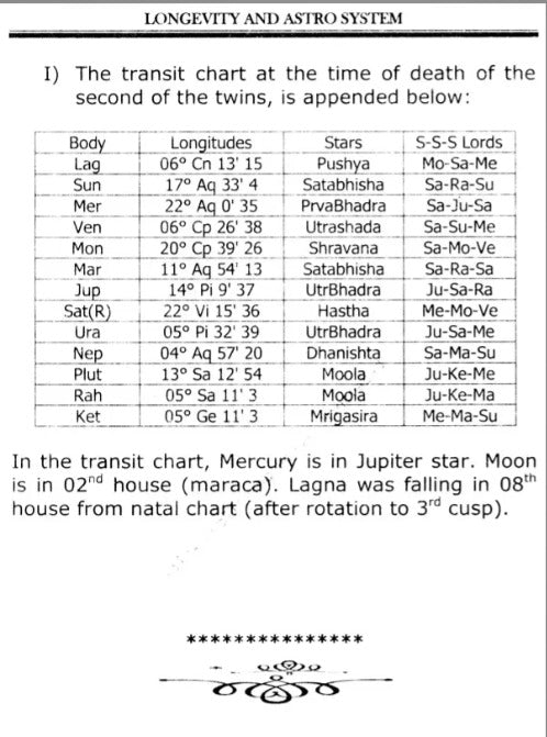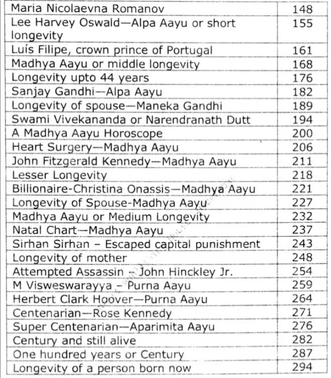 ২. **দীর্ঘায়ুর সূচক**: নির্দিষ্ট জ্যোতিষশাস্ত্রীয় চিহ্নগুলির বিশদ পরীক্ষা যা সম্ভাব্য দীর্ঘায়ু নির্দেশ করে, যেমন অষ্টম ঘর (আয়ুষ্কালের ঘর) এবং এর শাসক গ্রহ।