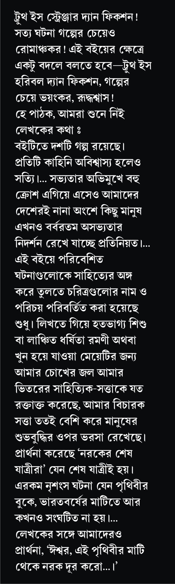 বিস্তারিত: প্রায়শই বলা হয় যে সত্য কল্পকাহিনীর চেয়েও অপরিচিত, কিন্তু এই ক্ষেত্রে, সত্য কল্পকাহিনীর চেয়েও শোচনীয়। একজন বিচারক, রাজশ্রী বসু অধিকারী, নারীর বিরুদ্ধে সহিংসতার ১০টি ভয়াবহ ঘটনা সামনে এনেছেন। নাম প্রকাশে অনিচ্ছুক থাকার জন্য তিনি যে সত্য ঘটনাগুলি কাল্পনিকভাবে তুলে ধরেছিলেন, এই ঘটনাগুলি একদিকে মানবিক বর্বরতা এবং অন্যদিকে একজন নিরপেক্ষ, মহিলা বিচারকের দৃষ্টিভঙ্গি চিত্রিত করে। নৈতিকতা এবং আইনসঙ্গততার মুখোমুখি হয়ে, লেখকের বিচারিক রায় মানবজাতির মুক্তিদাতা গুণাবলীর উপর প্রচুর বিশ্বাস স্থাপন করে। 'নরোকের শেষ যাত্রী' আমাদের সকলের মধ্যে একটি নীরব প্রার্থনা জাগিয়ে তোলে - মানবিক অবক্ষয় দূর করার জন্য একটি প্রার্থনা।