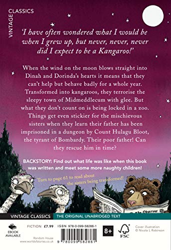 বিস্তারিত: 'আমি প্রায়ই ভাবতাম বড় হয়ে আমি কী হব, কিন্তু কখনোই ভাবিনি, কখনোই না, কখনোই ভাবিনি যে আমি ক্যাঙ্গারু হব!' চাঁদের বাতাস যখন সরাসরি দিনা এবং ডোরিন্ডার হৃদয়ে ঢুকে পড়ত, তখন বোঝা যেত যে তারা পুরো এক বছর ধরে খারাপ আচরণ না করে থাকতে পারত না। ক্যাঙ্গারুতে রূপান্তরিত হয়ে, তারা ঘুমন্ত শহর মিডমেডলকামকে আনন্দে আতঙ্কিত করে। কিন্তু তারা যা আশা করেনি তা হল চিড়িয়াখানায় বন্দী থাকার কথা। দুষ্টু বোনদের জন্য পরিস্থিতি আরও কঠিন হয়ে ওঠে যখন তারা জানতে পারে যে বোম্বার্ডির অত্যাচারী কাউন্ট হুলাগু ব্লুট তাদের বাবাকে একটি অন্ধকূপে বন্দী করেছে। তাদের দরিদ্র বাবা! তারা কি সময়মতো তাকে উদ্ধার করতে পারবে? এক্সক্লুসিভ উপাদান অন্তর্ভুক্ত: ব্যাকস্টোরিতে আপনি জানতে পারবেন যে এই বইটি লেখার সময় জীবন কেমন ছিল এবং আরও কিছু দুষ্টু শিশুর সাথে দেখা করতে পারবেন! ভিনটেজ চিলড্রেন'স ক্লাসিকস হল একবিংশ শতাব্দীর একটি ক্লাসিক তালিকা যা ৮-১২ বছর বয়সী এবং তাদের জীবনের প্রাপ্তবয়স্কদের লক্ষ্য করে তৈরি। দ্য জঙ্গল বুক এবং অ্যালিস'স অ্যাডভেঞ্চারস ইন ওয়ান্ডারল্যান্ড থেকে শুরু করে দ্য বয় ইন দ্য স্ট্রাইপড পায়জামা এবং দ্য কিউরিয়াস ইনসিডেন্ট অফ দ্য ডগ ইন দ্য নাইট-টাইমের মতো আধুনিক ক্লাসিক পর্যন্ত চিরন্তন প্রিয় বইগুলি আবিষ্কার করুন।