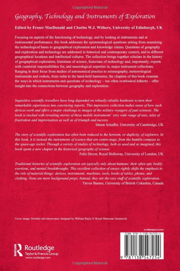 Focusing on aspects of the functioning of technology, and by looking at instruments and at instrumental performance, this book addresses the epistemological questions arising from examining the technological bases to geographical exploration and knowledge claims. Questions of geography, exploration, and technology are addressed in historical and contemporary context and in different geographical locations and intellectual cultures. The collection brings together scholars in the history of geographical exploration, historians of science, historians of technology, and importantly, experts with curatorial responsibilities for, and museological expertise in, major instrument collections. Ranging in their focus from studies of astronomical practice to seismography, meteorological instruments, and rockets, from radar to the hand-held barometer, the chapters of this book examine the ways in which instruments and questions of technology—too often overlooked hitherto—offer insight into the connections between geography and exploration.