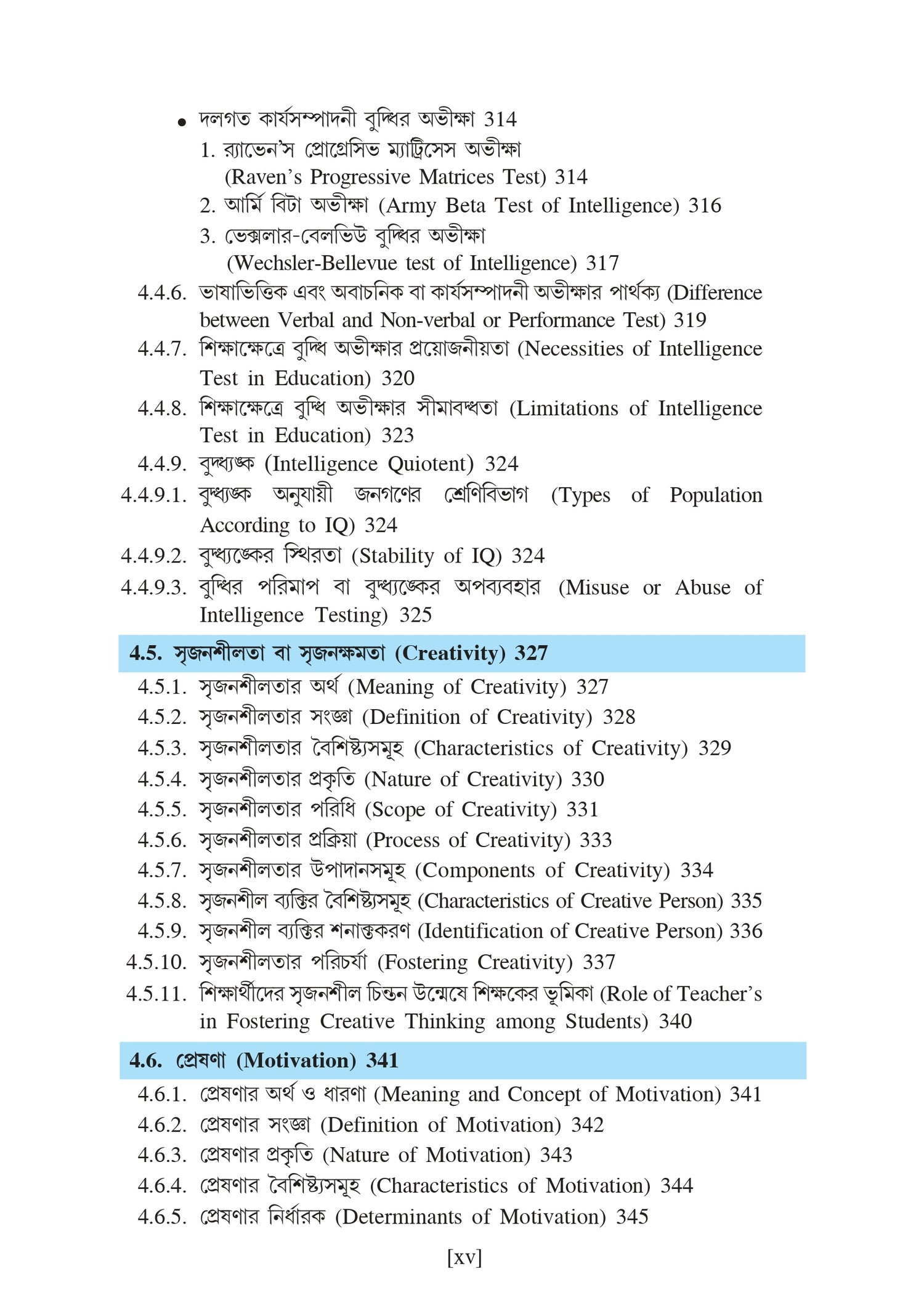 l সৃজনশীলতা—ধারণা এবং প্রকৃতি, একজন সৃজনশীল ব্যক্তির বৈশিষ্ট্য, লালন-পালন, সৃজনশীলতা, মেটাকগনিশন এবং সৃজনশীলতা।