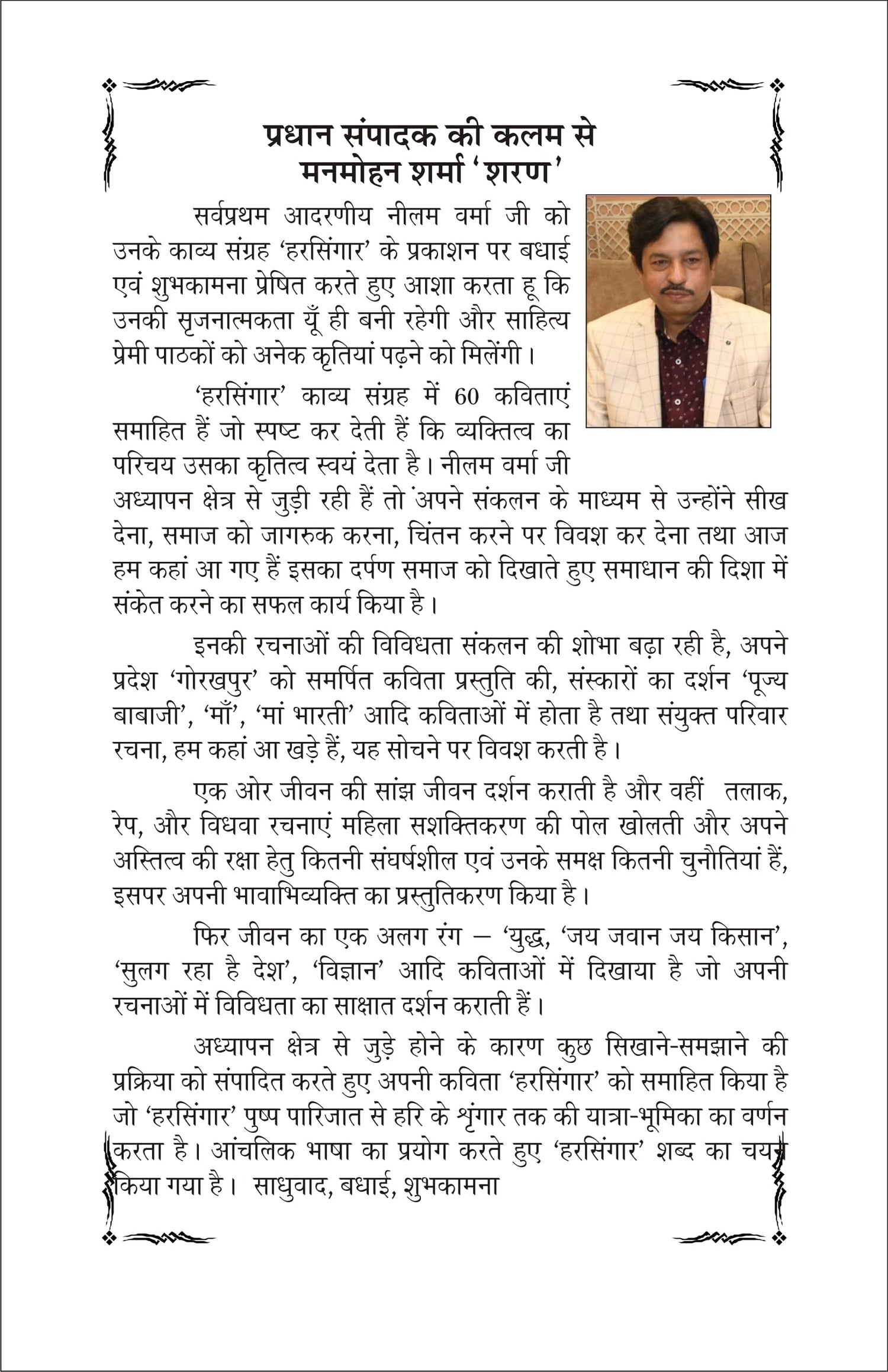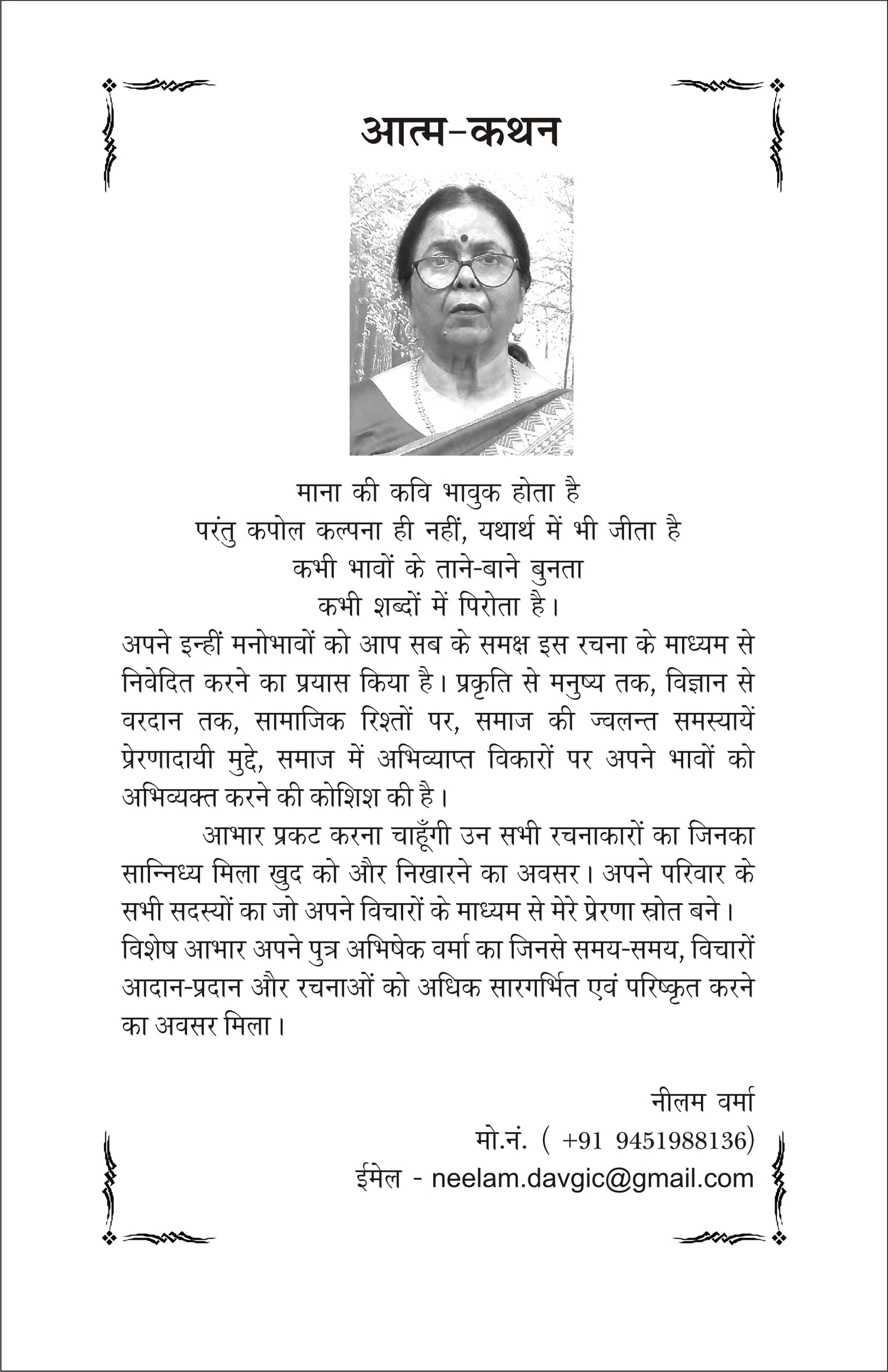This Hindi literary work by Smt. Neelam Verma presents a soulful collection of writings that beautifully express human emotions, experiences, and reflections on life. Each piece is written with deep sensitivity and simplicity, capturing the true essence of Hindi literature.