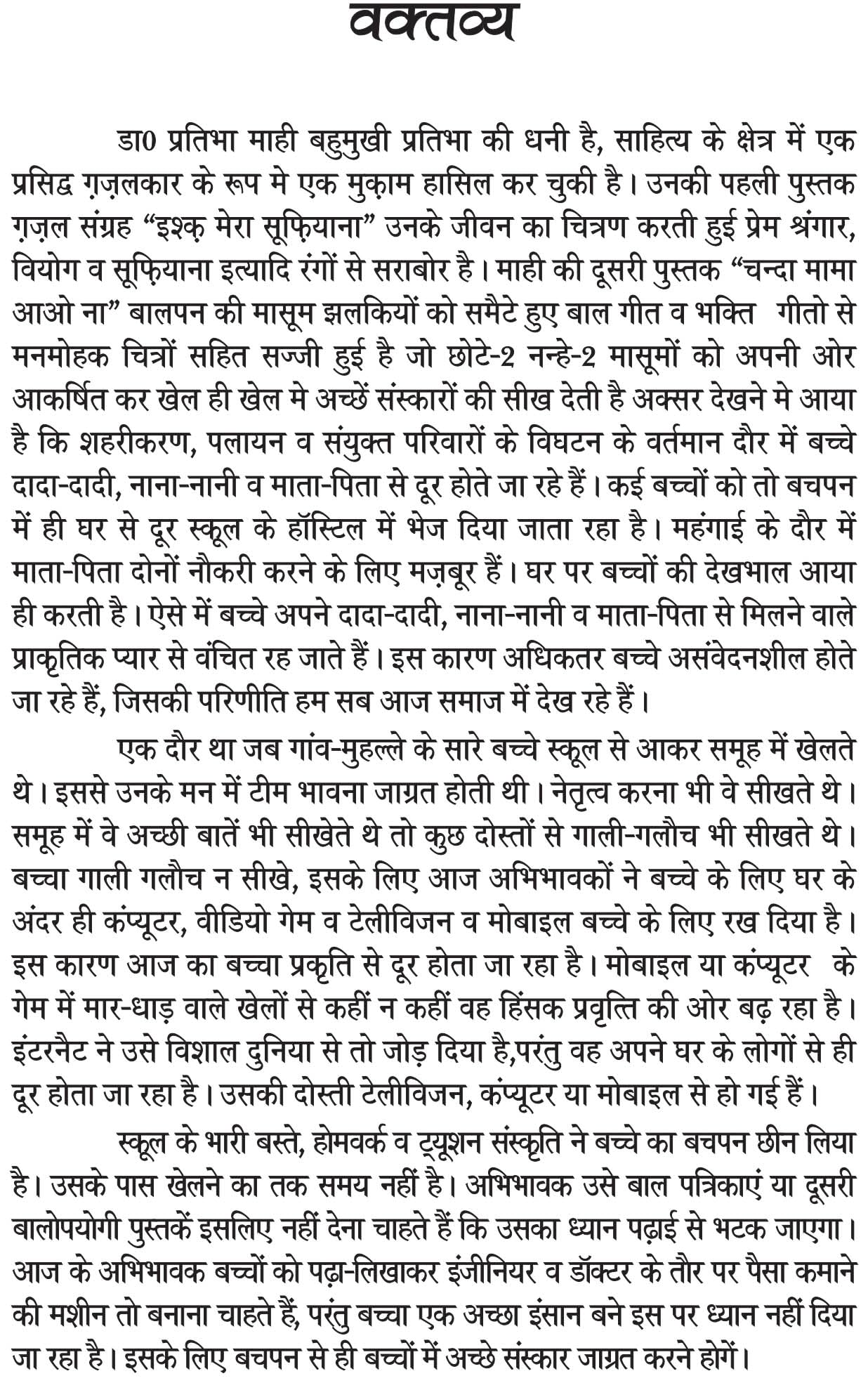 This Hindi poetry book for children by Dr. Pratibha Mahi offers a delightful collection of poems designed to spark imagination, creativity, and a love for language. The poems are written in simple, engaging Hindi that children can easily understand and enjoy, making reading both fun and educational.