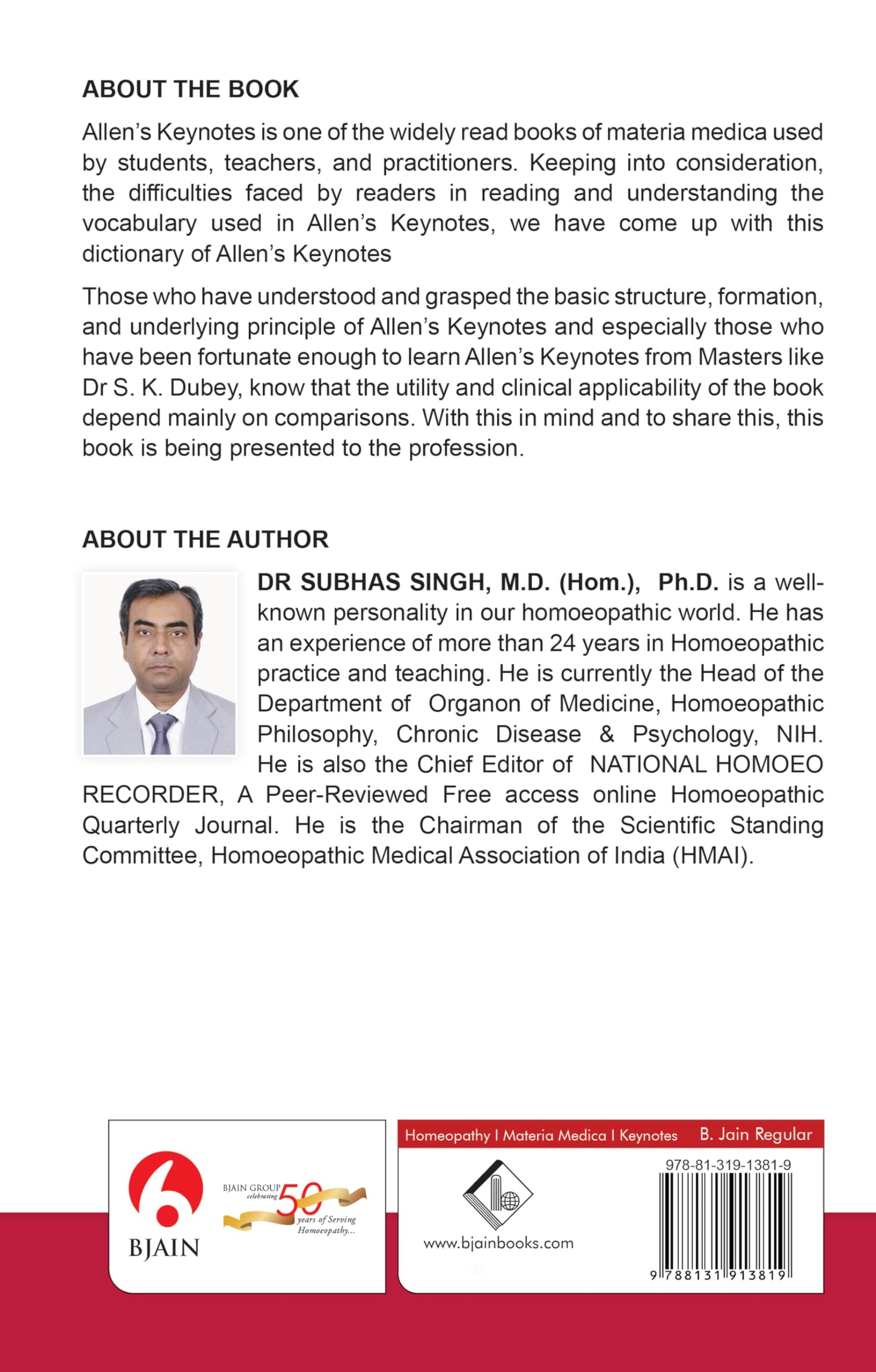 বিস্তারিত : এই বইটি অ্যালেনের মূল নোটগুলির জন্য একটি অভিধান হিসেবে কাজ করে, যা অ-ইংরেজি ভাষাভাষী বা মূল লেখায় ব্যবহৃত কিছু পুরানো পরিভাষার সাথে অপরিচিত ব্যক্তিদের মুখোমুখি হওয়া চ্যালেঞ্জগুলিকে মোকাবেলা করে। যদিও অ্যালেনের মূল নোটগুলি হোমিওপ্যাথিতে সর্বাধিক জনপ্রিয় এবং প্রায়শই ব্যবহৃত বইগুলির মধ্যে একটি হিসাবে বিবেচিত হয়, তবে এর জটিল ভাষা বোঝা কঠিন হতে পারে। লেখক নির্বাচিত শব্দগুলির জন্য শব্দের অর্থ প্রদান করেছেন, যা পাঠকদের মূল বইতে ব্যবহৃত চ্যালেঞ্জিং শব্দভাণ্ডার এবং নামকরণের মধ্যে নেভিগেট করতে সহায়তা করে।