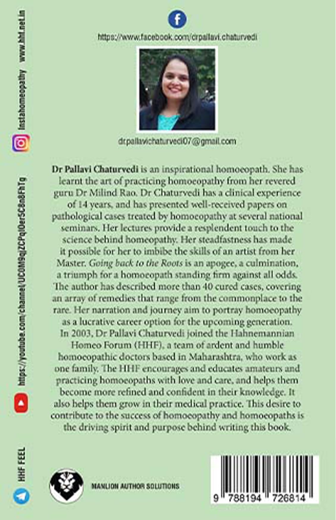 "গোয়িং ব্যাক টু দ্য রুটস" হল ডঃ পল্লবী চতুর্বেদীর একটি গভীর ব্যক্তিগত এবং অনুপ্রেরণামূলক যাত্রা যার লক্ষ্য তরুণ হোমিওপ্যাথদের আত্মবিশ্বাস এবং আবেগের সাথে হোমিওপ্যাথি অনুসরণ করতে উৎসাহিত করা।