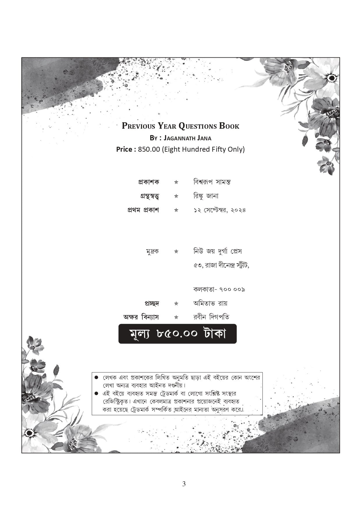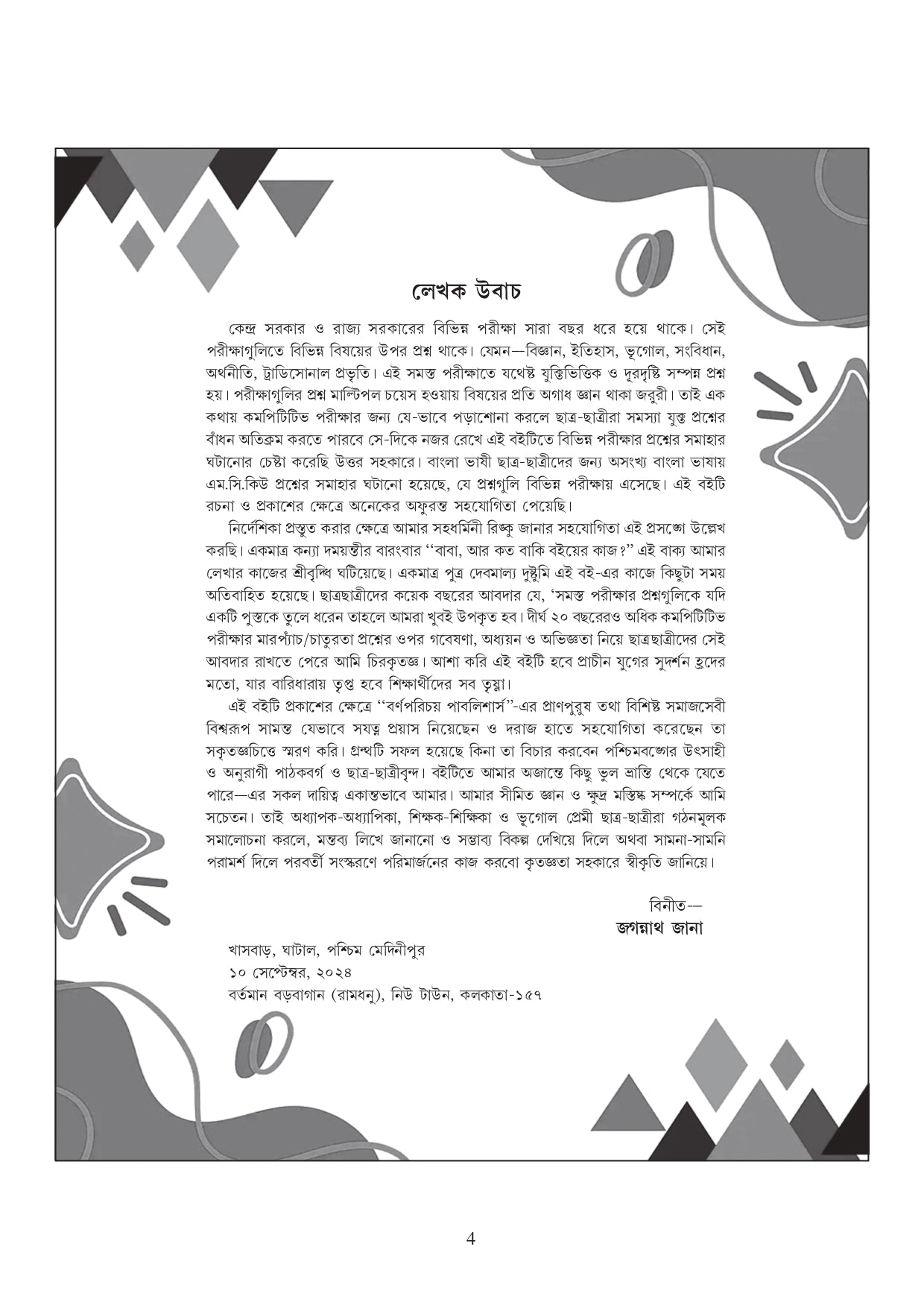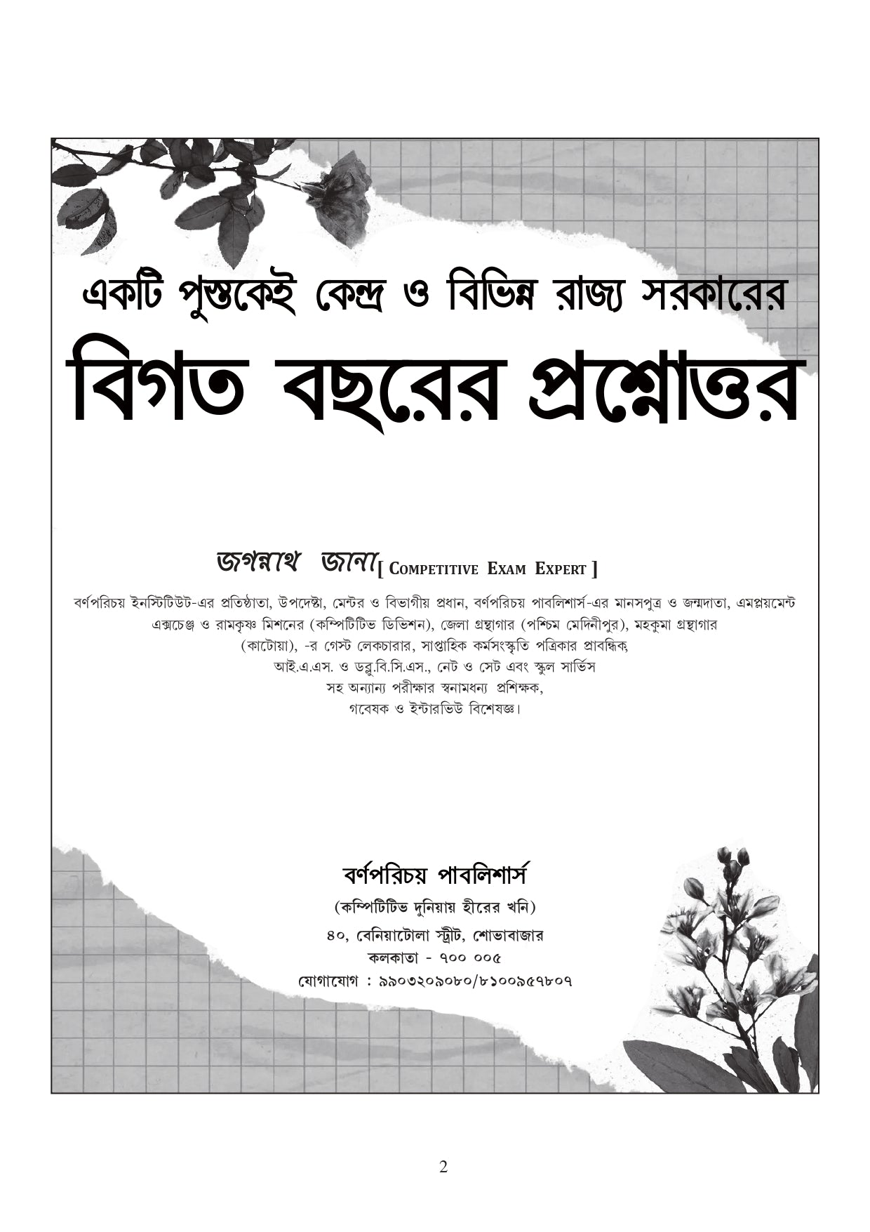 বিস্তারিত: জগন্নাথ জানা রচিত "পূর্ববর্তী বছরের প্রশ্ন ও উত্তর ২০০০০ এমসিকিউ (বাংলা সংস্করণ)", যা বর্ণপরিচয় পাবলিশার্স দ্বারা প্রকাশিত, প্রতিযোগিতামূলক পরীক্ষার প্রস্তুতি নিচ্ছেন এমন শিক্ষার্থীদের জন্য একটি বিস্তৃত সম্পদ। এতে সম্ভবত বছর অনুসারে বিভিন্ন বিষয়ের বহুনির্বাচনী প্রশ্নের (এমসিকিউ) একটি বিশাল সংগ্রহ রয়েছে, যা শিক্ষার্থীদের পরীক্ষার ফর্ম্যাট এবং প্রায়শই পরীক্ষিত বিষয়গুলির সাথে পরিচিত হতে সাহায্য করতে পারে।