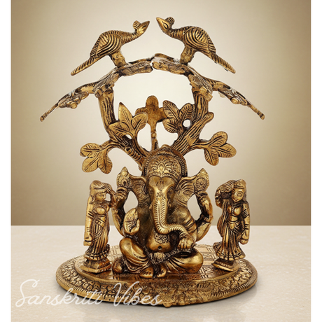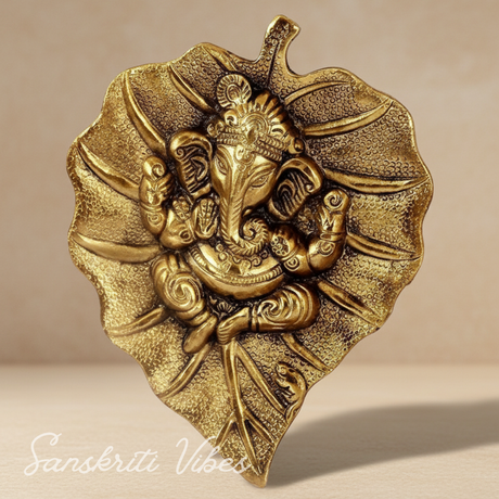 Golden Ganesha on Antique Finish Leaf Metal Handicraft Decorative Showpiece 19 cm