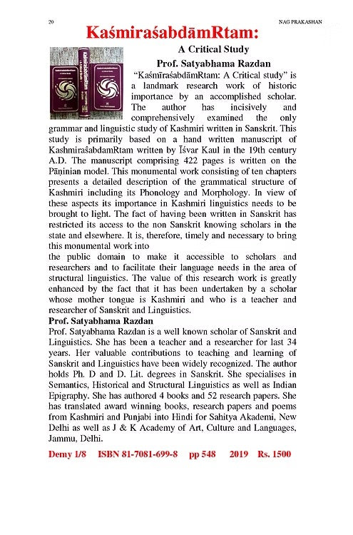 “KaśmīraśabdāmRtam: A Critical study” is a landmark research work of historic importance by an accomplished scholar. The author has incisively and comprehensively examined the only grammar and linguistic study of Kashmiri written in Sanskrit. This study is primarily based on a hand written manuscript of KashmiraŝabdamRtam written by Īśvar Kaul in the 19th century A.D. The manuscript comprising 422 pages is written on the Pāṇinian model. This monumental work consisting of ten chapters presents a detailed description of the grammatical structure of Kashmiri including its Phonology and Morphology. In view of these aspects its importance in Kashmiri linguistics needs to be brought to light. The fact of having been written in Sanskrit has restricted its access to the non Sanskrit knowing scholars in the state and elsewhere. It is, therefore, timely and necessary to bring this monumental work into
