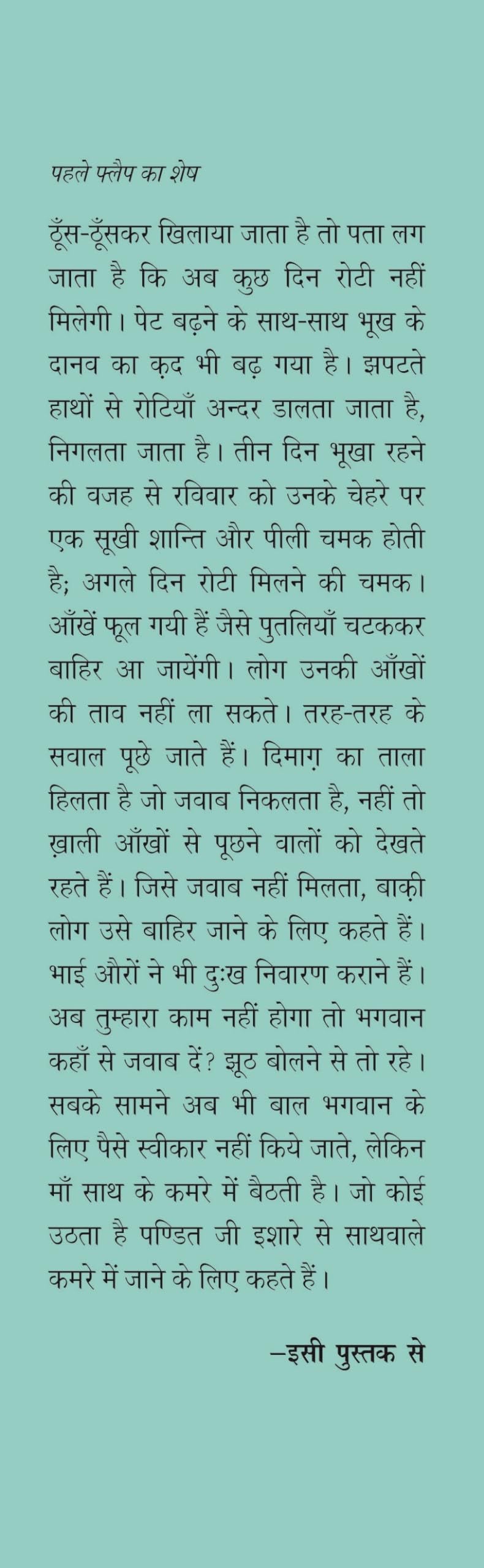 Details: बाल भगवान की ज्यों-ज्यों प्रसिद्धि फैल रही है, त्यों-त्यों पेट भी फैलना-फूलना शुरू हो गया है। एक ही शब्द में बात करते हैं। कई बार ठीक, कई बार गलत । जिन लोगों को बताया जवाब ग़लत निकलता है, वह अपने कर्मों को दोष देकर चुप हो जाते हैं। जिनका जवाब सही निकलता है, वह पुण्य कमाने के लिए और लोगों को भगवान की शरण में भेजते हैं। फिर इधर की उर्दू की अख़बारें चटखारे लेकर ऐसी ख़बरें छापती हैं। और बुजुर्ग लोग, दुकानदार तबका अब भी उर्दू के अख़बारें पढ़ता है। चटपटी ख़बर और चटखारे लेने वाली जुबान । और फिर प्रत्येक छोटी-छोटी दुकान रेडियो स्टेशन होती है जहाँ समय विशेष पर नहीं, सारा समय समाचार दर्शन चलता रहता है। हर इतवार लाले की दुकान के आगे कारों, साइकिलों और स्कूटरों की भीड़ लग जाती है। उसके पास अब तीन छोकरे हैं। चाय-पानी पिलाते-पिलाते हाँफ जाते हैं। अब बाल भगवान को हफ्ते में सिर्फ तीन दिन खाने को दिया जाता है। वीरवार खाना बन्द और सोमवार शुरू। दिमाग तालाबन्द है तो क्या हुआ? बाकी इन्द्रियाँ तो काम करती हैं। उन्हें अब बुधवार को सारा दिन ठूस-ठूंसकर खिलाया जाता है तो पता लग जाता है कि अब कुछ दिन रोटी नहीं मिलेगी। पेट बढ़ने के साथ-साथ भूख के दानव का कद भी बढ़ गया है। झपटते हाथों से रोटियाँ अन्दर डालता जाता है, निगलता जाता है। तीन दिन भूखा रहने की वजह से रविवार को उनके चेहरे पर एक सूखी शान्ति और पीली चमक होती है; अगले दिन रोटी मिलने की चमक । आँखें फूल गयी हैं जैसे पुतलियाँ चटककर बाहिर आ जायेंगी। लोग उनकी आँखों की ताव नहीं ला सकते । तरह-तरह के सवाल पूछे जाते हैं। दिमाग़ का ताला हिलता है जो जवाब निकलता है, नहीं तो ख़ाली आँखों से पूछने वालों को देखते रहते हैं। जिसे जवाब नहीं मिलता, बाकी लोग उसे बाहिर जाने के लिए कहते हैं। भाई औरों ने भी दुःख निवारण कराने हैं। अब तुम्हारा काम नहीं होगा तो भगवान कहाँ से जवाब दें? झूठ बोलने से तो रहे । सबके सामने अब भी बाल भगवान के लिए पैसे स्वीकार नहीं किये जाते, लेकिन माँ साथ के कमरे में बैठती है। जो कोई उठता है पण्डित जी इशारे से साथवाले कमरे में जाने के लिए कहते हैं। -इसी पुस्तक से