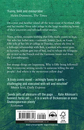 On a peat and heather island off the West Coast of Scotland, Effie and her mother, Nora, take refuge in the large mouldering house of their ancestors and tell each other stories. Nora, at first, recounts nothing that Effie really wants to hear, such as the identity of her real father – variously Jimmy, Jack, or Ernie. Effie tells of her life at college in Dundee, the land of cakes and William Wallace, where she lives in a lethargic relationship with Bob, a student who never goes to lectures, seldom gets out of bed, and to whom the Klingons are as real as the French and the Germans. But strange things are happening. Why is Effie being followed? Is someone killing the old people? And where is the mysterious yellow dog?
