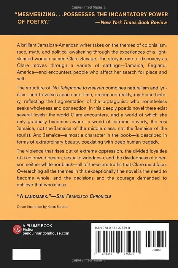 The structure of No Telephone to Heaven combines naturalism and lyricism, and traverses space and time, dream and reality, myth and history, reflecting the fragmentation of the protagonist, who nonetheless seeks wholeness and connection. In this deply poetic novel there exist several levels: the world Clare encounters, and a world of which she only gradually becomes aware – a world of extreme poverty, the real Jamaica, not the Jamaica of the middle class, not the Jamaica of the tourist. And Jamaica – almost a character in the book – is described in terms of extraordinary beauty, coexisting with deep human tragedy.