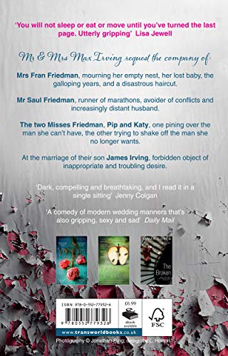 Mr & Mrs Max Irving request the company of:Mrs Fran Friedman, mourning her empty nest, the galloping years and a disastrous haircut.Mr Saul Friedman, runner of marathons, and increasingly distant husband.The two Misses Friedman, Pip and Katy, one pining over the man she can’t have, the other trying to shake off the man she no longer wants.At the marriage of their son James, forbidden object of troubling desire. For thirty-six hours of secrets and lies, painted-on-smiles and potential ruin. And drinks, plenty of drinks.There’s nothing like a wedding for stirring up the past. As Fran negotiates her way from Saturday morning to Sunday evening she is forced to confront things she’s long thought buried, and to make decisions about the future that will have far-reaching consequences for them all.