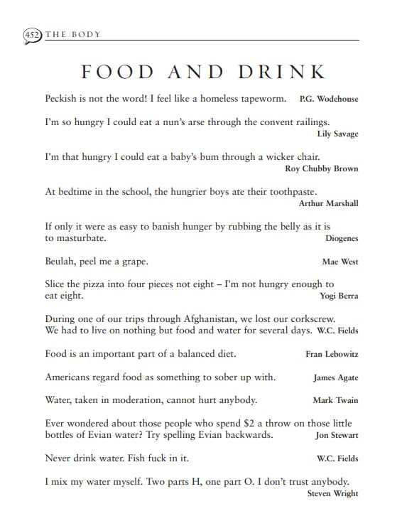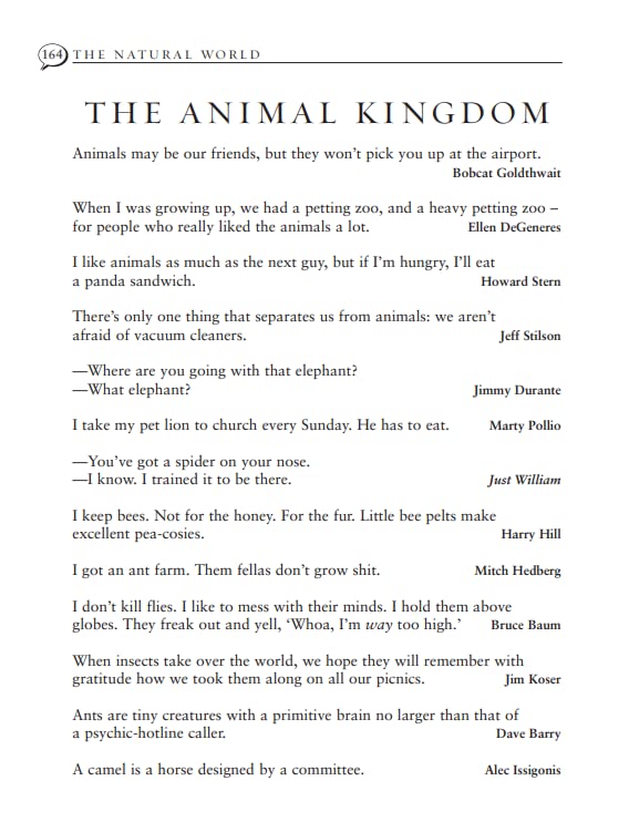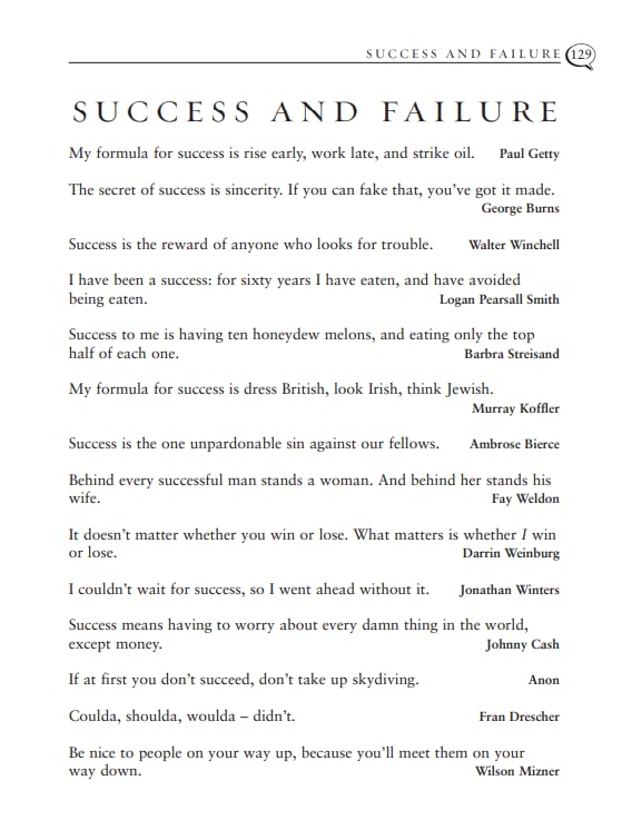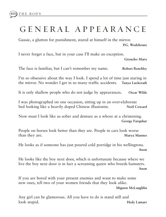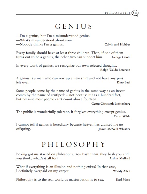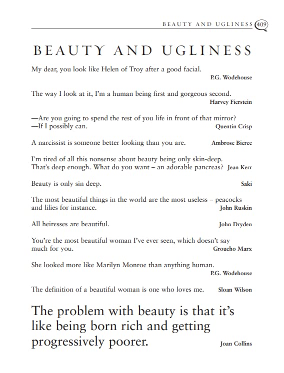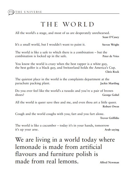 Quotations are ordered not by A-Z, but by thematic categories: love; business; religion; celebrity; the animal kingdom, intellect; dating; hair - you name it, every category is covered.