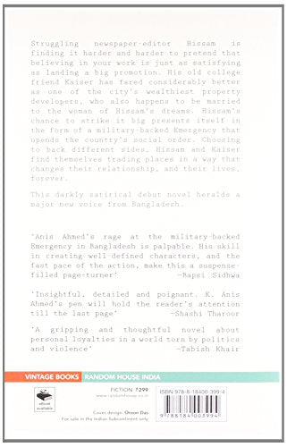 বিস্তারিত: সংগ্রামরত সংবাদপত্র-সম্পাদক হিসামের জন্য এটা ভাবা ক্রমশ কঠিন হয়ে উঠছে যে, নিজের কাজের উপর বিশ্বাস রাখা বড় পদোন্নতির মতোই তৃপ্তিদায়ক। তার পুরনো কলেজ বন্ধু কায়সার শহরের অন্যতম ধনী সম্পত্তি বিকাশকারী হিসেবে যথেষ্ট ভালো করেছেন, যিনি হিসামের স্বপ্নের মহিলার সাথেও বিবাহিত। হিসামের বড় সুযোগটি সামরিক বাহিনী সমর্থিত জরুরি অবস্থার আকারে নিজেকে উপস্থাপন করে যা দেশের সামাজিক শৃঙ্খলাকে বিপর্যস্ত করে। ভিন্ন পক্ষকে সমর্থন করার সিদ্ধান্ত নিয়ে, হিসাম এবং কায়সার নিজেদের মধ্যে এমনভাবে বিনিময় খুঁজে পান যা তাদের সম্পর্ক এবং জীবনকে চিরতরে বদলে দেয়। সমৃদ্ধ ব্যঙ্গাত্মক এই উপন্যাসটি বাংলাদেশের একটি নতুন কণ্ঠস্বরের সূচনা করে।