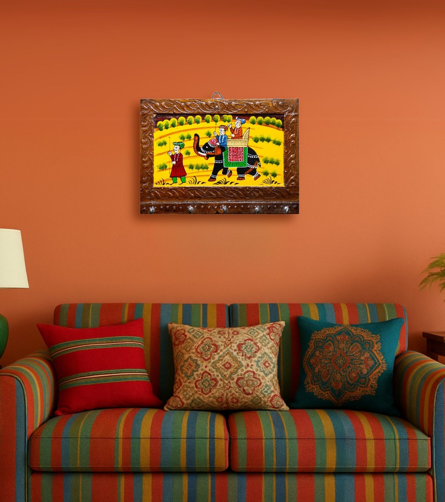 Celebrate the timeless love story of Dhola and Maru with this exquisitely hand-painted wooden key holder. Featuring vibrant Rajasthani folk art on a beautifully carved wooden frame, this key holder is more than just a functional piece—it's a cultural statement for your home. The 5 sturdy metal hooks provide a practical solution for organizing keys, while the intricate floral borders and rich colors bring a touch of traditional artistry to your space.