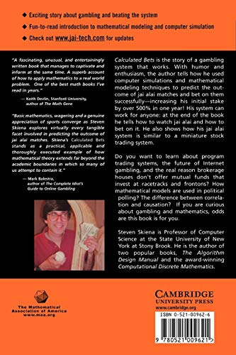 Details: This is a book about a gambling system that works. It tells the story of how the author used computer simulations and mathematical modeling techniques to predict the outcome of jai-alai matches and bet on them successfully - increasing his initial stake by over 500% in one year! His results can work for anyone: at the end of the book he tells the best way to watch jai-alai, and how to bet on it. With humour and enthusiasm, Skiena details a life-long fascination with computer predictions and sporting events. Along the way, he discusses other gambling systems, both successful and unsuccessful, for such games as lotto, roulette, blackjack, and the stock market. Indeed, he shows how his jai-alai system functions just like a miniature stock trading system. Do you want to learn about program trading systems, the future of Internet gambling, and the real reason brokerage houses don't offer mutual funds that invest at racetracks and frontons? How mathematical models are used in political polling? The difference between correlation and causation? If you are curious about gambling and mathematics, odds are this book is for you!