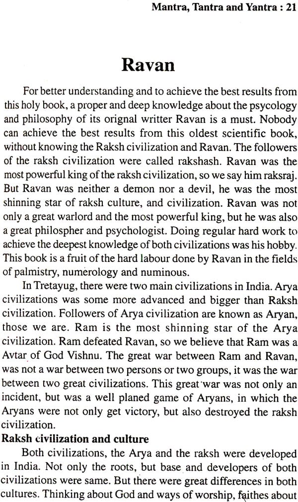রাবণ আর্য ও রাক্ষস উভয় সভ্যতার কঠোর অধ্যয়নে নিজেকে নিবেদিত করেছিলেন, গভীর জ্ঞান অর্জনের জন্য প্রচেষ্টা করেছিলেন। এই বইটি হস্তরেখাবিদ্যা, সংখ্যাতত্ত্ব এবং রহস্যময় বিজ্ঞানের ক্ষেত্রে তাঁর অপরিসীম অবদানের প্রমাণ। প্রাচীন জ্ঞানের ভান্ডার, এটি পাঠকদের ইতিহাসের সবচেয়ে ভুল বোঝাবুঝি কিন্তু উজ্জ্বল মনের একটি অন্তর্দৃষ্টি প্রদান করে।