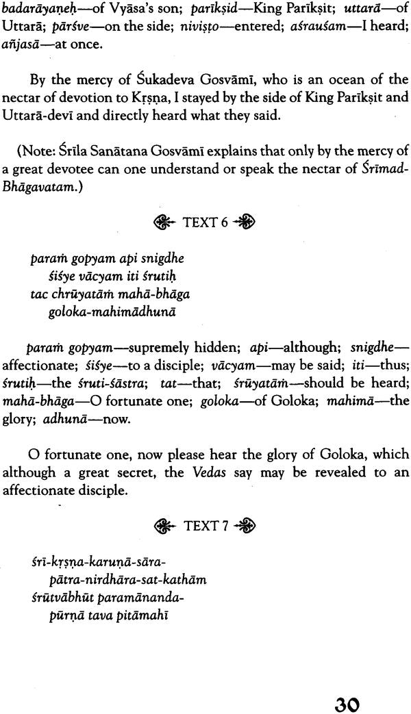 In this second part of Brhad-bhagavatamrta, a cowherd boy from Govardhana Hill, Gopa-kumara, narrates to a brahmana the story of his extensive travels. After being initiated into the chanting of a ten-syllable mantra of Lord Madana-Gopala, Gopa-kumara began his travels throughout the universe and beyond the universe, in search for the ultimate goal of his life. This quest took him to Svargaloka, Tapoloka, the coverings of the universe, Sivaloka, and Vaikuntha.
