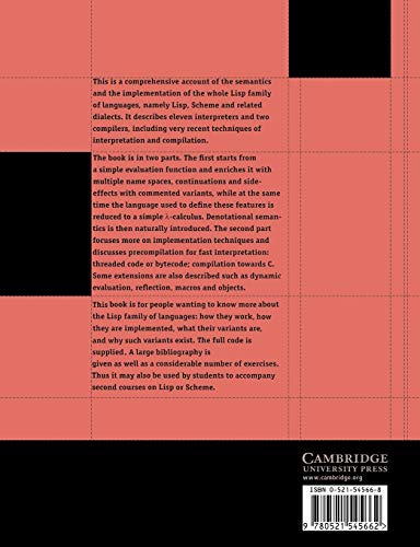 Details: This is a comprehensive account of the semantics and the implementation of the whole Lisp family of languages, namely Lisp, Scheme and related dialects. It describes 11 interpreters and 2 compilers, including very recent techniques of interpretation and compilation. The book is in two parts. The first starts from a simple evaluation function and enriches it with multiple name spaces, continuations and side-effects with commented variants, while at the same time the language used to define these features is reduced to a simple lambda-calculus. Denotational semantics is then naturally introduced. The second part focuses more on implementation techniques and discusses precompilation for fast interpretation: threaded code or bytecode; compilation towards C. Some extensions are also described such as dynamic evaluation, reflection, macros and objects. This will become the new standard reference for people wanting to know more about the Lisp family of languages: how they work, how they are implemented, what their variants are and why such variants exist. The full code is supplied (and also available over the Net). A large bibliography is given as well as a considerable number of exercises. Thus it may also be used by students to accompany second courses on Lisp or Scheme.