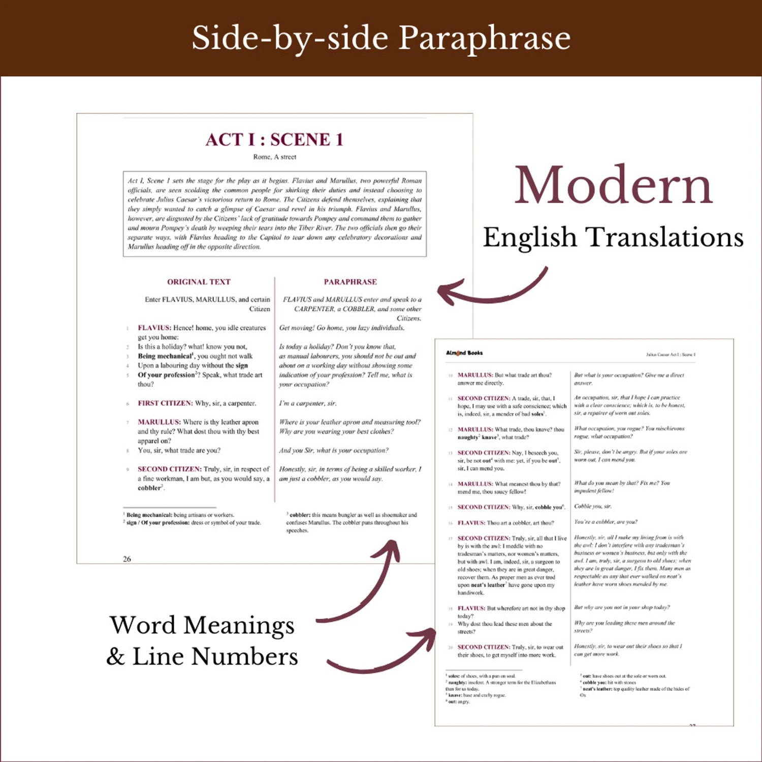 • Complete Text with Paraphrase: The book includes all five acts of Julius Caesar, with scene-by-scene paraphrasing in modern English, ensuring students can easily follow the original text.