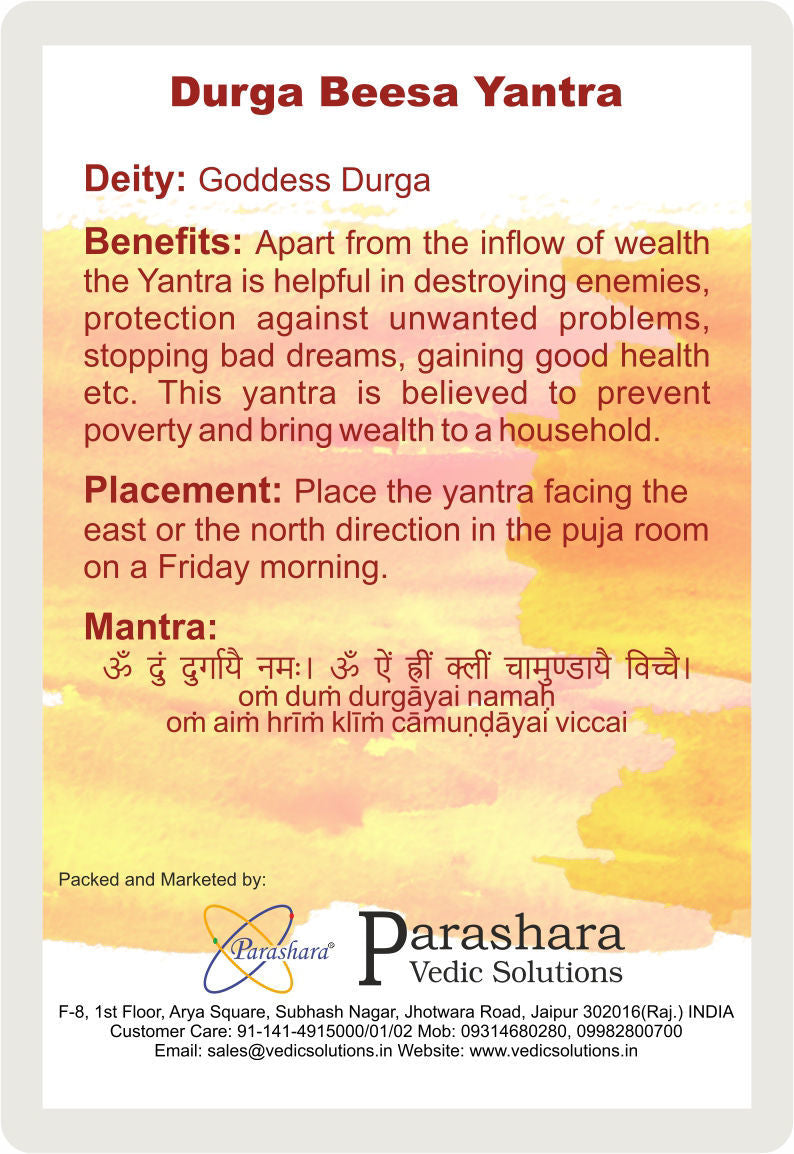 The Arkam Durga Beesa Yantra in gold-plated copper (2 x 2 inches, golden) is a compact yet powerful spiritual tool dedicated to Goddess Durga, revered for protection, prosperity, and success. This Yantra is believed to attract wealth, guard against enemies, and shield the worshipper from unwanted problems and negative influences. It helps prevent poverty, enhances health, stops bad dreams, and fulfills desires. Popular among businessmen, it aids in attaining financial success while removing obstacles and offering spiritual protection. Its elegant golden finish makes it a beautiful and auspicious addition to homes, offices, or personal altars.