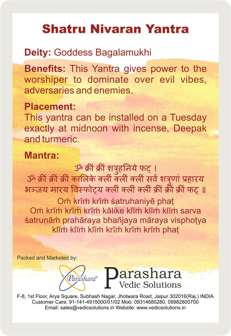 The Arkam Shatru Nivaran Yantra, also known as Shatru Nashak Yantra or Shatru Vijay Yantra, is a powerful Vedic yantra crafted in gold-plated copper with dimensions of 2 x 2 inches. Dedicated to Goddess Bagalamukhi, this sacred yantra radiates divine energy that shields the worshipper from enemies, negative influences, and malefic planetary effects.