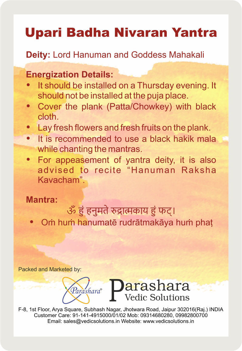 The Arkam Upari Badha Nivaran Yantra, also crafted in gold-plated copper with a compact size of 2 x 2 inches, is a sacred Vedic yantra dedicated to Lord Hanuman and Goddess Maha Kali. This yantra is specifically worshipped to ward off ghosts, evil spirits, and other negative energies that disturb the harmony of your home or workplace.