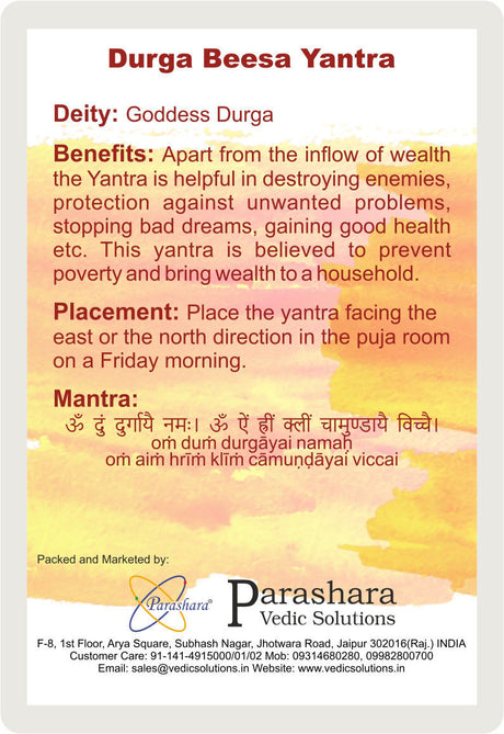 Arkam Durga Beesa Yantra / Durga Bisa Yantra - Gold Plated Copper - (2 x 2 inches, Golden)