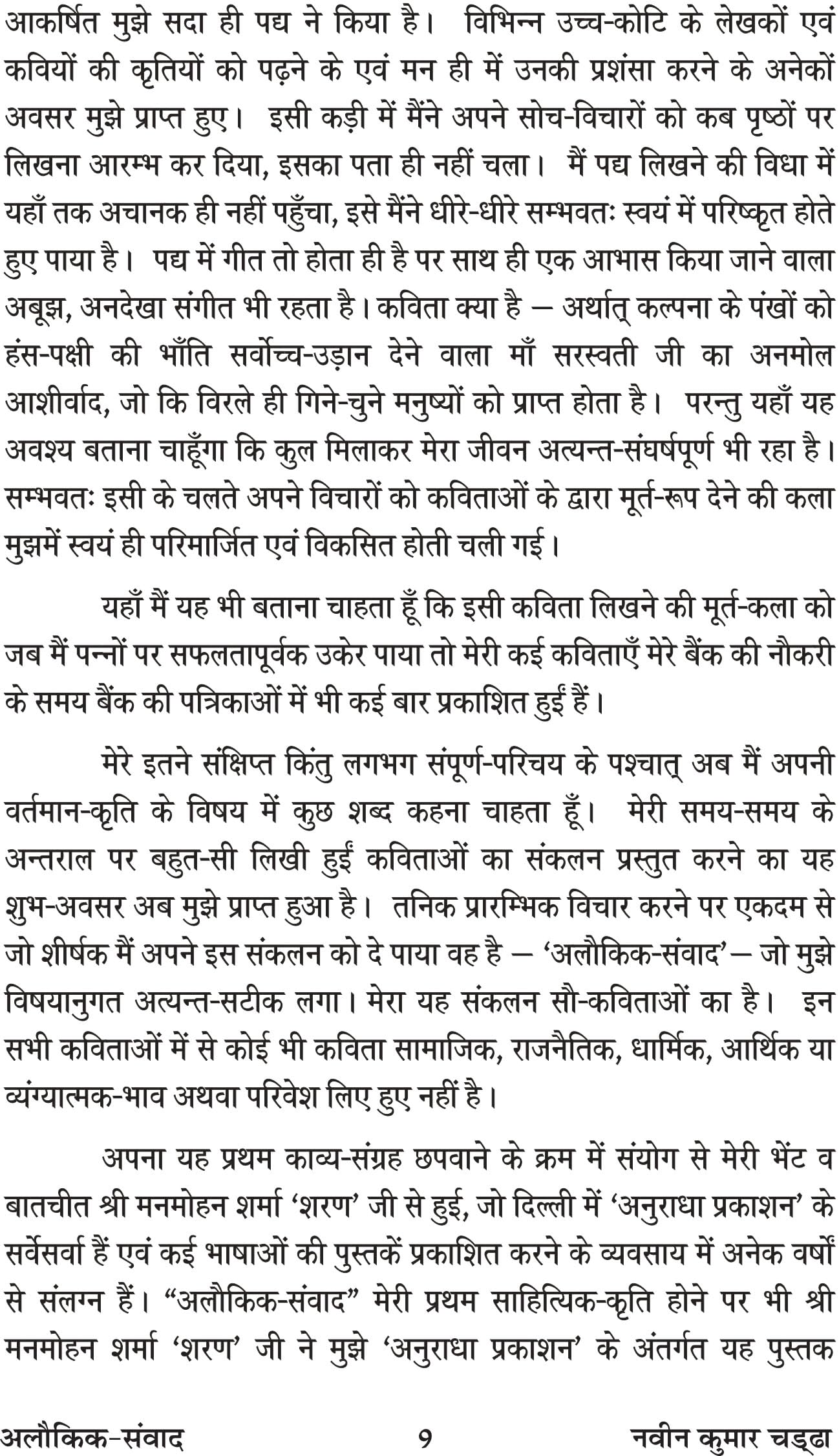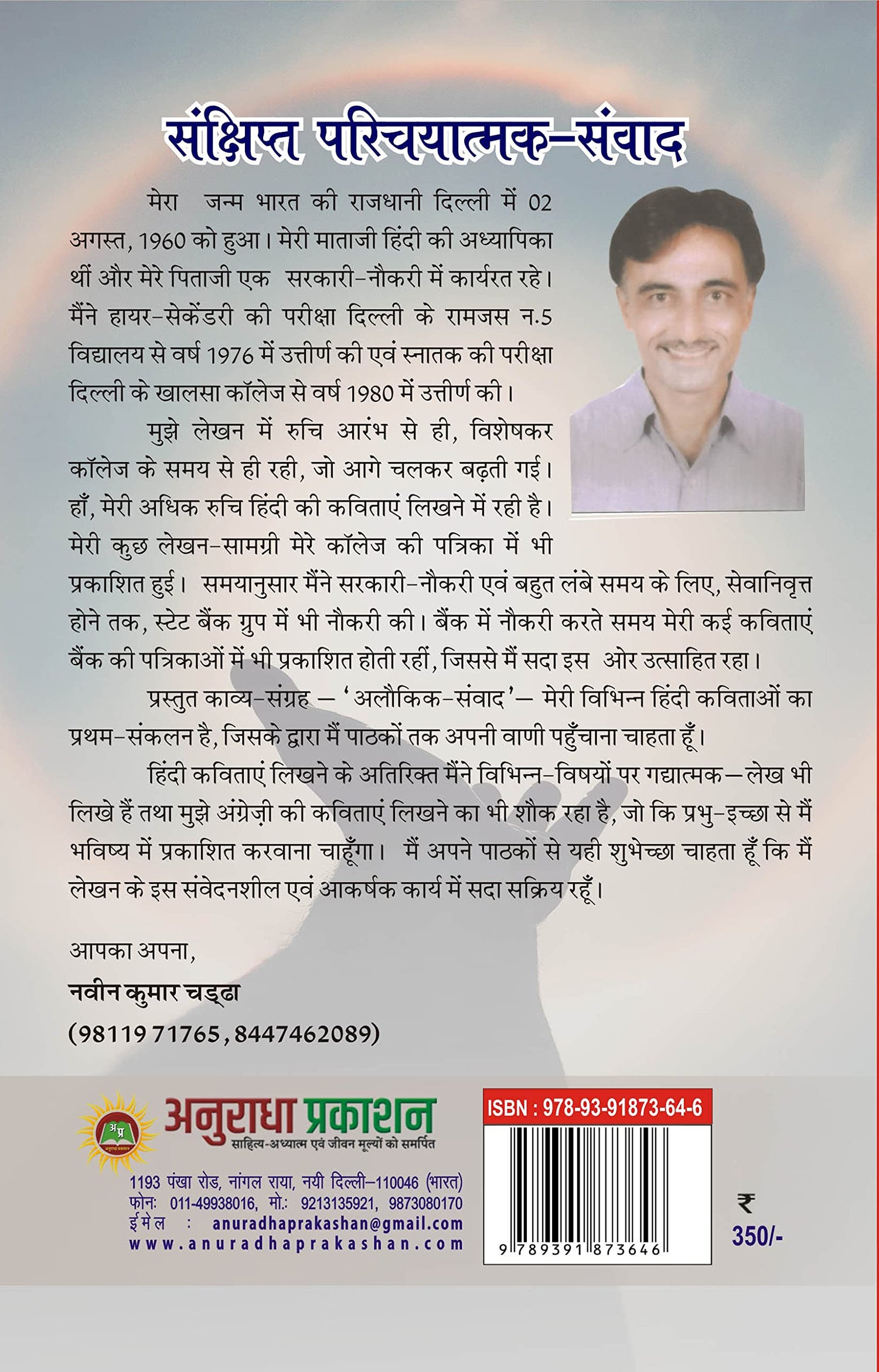 This Hindi poetry collection by Mr. Naveen Kumar Chadha, published by Anuradha Prakashan, is a beautiful expression of emotions, experiences, and reflections woven into lyrical verses. Each poem captures the depth of human feelings and the subtleties of life, love, and introspection.