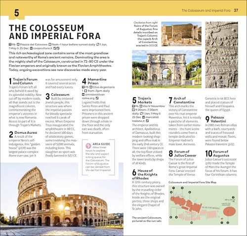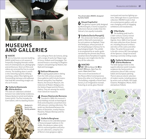 • Top 10 lists of Rome's must-sees, including detailed descriptions of Galleria Borghese, Ostia Antica, the Roman Forum, Vatican City, the Pantheon, the Colosseum and Imperial Flora, Musei Capitolini, Santa Maria del Popolo, Villa Giulia and Museo Nazionale Romano