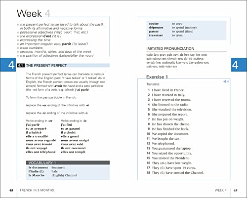 The 12 weekly chapters contain lessons on the key grammatical structures and present a range of useful vocabulary, along with exercises to reinforce your learning. The essentials of French grammar are clearly explained and tested in conversational exercises, giving you the authentic feel of the language. In addition to a written "imitated pronunciation" guide, which replaces French sounds with English syllables you're already familiar with, the new audio app also allows you to perfect your pronunciation - at home or on the go.