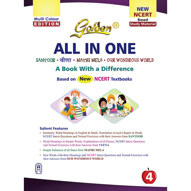 Golden All In One Study Material Based on NEW NCERT (Santoor, Veena, Maths Mela, Our Wondrous World) For Class 4 | Summary | Word-Meanings in English & Hindi | Translation of each Chapter in Hindi | NCERT Intext Questions and Textual Exercises
