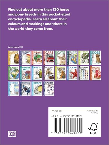 Details: Saddle up and jump into the wonderful world of horses with the perfect guide for any fan who wants to know everything about horses and ponies. Discover more than 135 horse and pony breeds, from the Holstein to the Shetland, the Swedish Warmblood to the Hackney Pony, and learn about the different colours and markings horses can have. Look at how the equine family has evolved from a small deer-like creature and delve into horse behaviour. Find out how they are used in sports and at work, and even learn about a horse's anatomy. Giving you fast facts for kids at your fingertips, Pocket Eyewitness Horses makes learning about horses even more exciting, with bite-sized chunks of information and vibrant photography bringing the horses and ponies alive on the page. Packed with amazing encyclopedic stats, helpful photographs for each horse and pony entry, and genius gem facts, Pocket Eyewitness Horses will help you get to know your trot from your canter and tell you everything you need to know about horses in this handy pocket-sized guide.