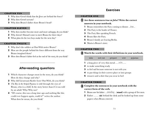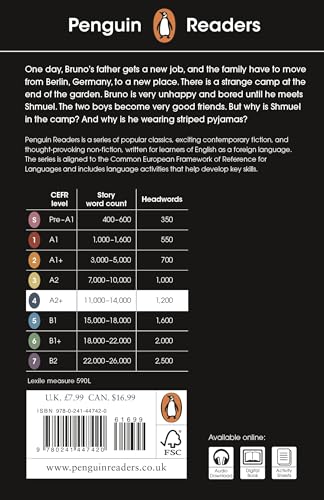 The boy in Striped pyjamas, a level 4 Reader, is A2+ in the CEFR framework. The text is made up of Sentences with up to three clauses, introducing more complex uses of present perfect simple, passive, phrasal verbs and simple relative clauses. It is well supported by illustrations, which appear regularly.