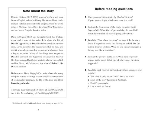 Details: Penguin Readers is an ELT graded reader series for learners of English as a foreign language. With carefully adapted text, new illustrations and language learning exercises, the print edition also includes instructions to access supporting material online. Titles include popular classics, exciting contemporary fiction, and thought-provoking non-fiction, introducing language learners to bestselling authors and compelling content. The eight levels of Penguin Readers follow the Common European Framework of Reference for language learning (CEFR). Exercises at the back of each Reader help language learners to practise grammar, vocabulary, and key exam skills. Before, during and after-reading questions test readers' story comprehension and develop vocabulary. Visit the Penguin Readers websiteExclusively with the print edition, readers can unlock online resources including a digital book, audio edition, lesson plans and answer keys. David Copperfield lives happily with his mother and his nurse, Peggotty. Then his mother marries Mr Murdstone, and he and his sister come to live with them. Suddenly everything changes . .