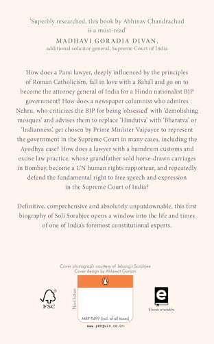 Details: How does a Parsi lawyer, deeply influenced by the principles of Roman Catholicism, fall in love with a Bahai and go on to become the Attorney General of India for a Hindu nationalist BJP government? How does a boy with a broken leg, who studied in a Gujarati medium school and lost his father at the age of nineteen, go on to mount a heroic defense of the Janata government's decision to dissolve Congress state legislatures in the Supreme Court in 1977? How does a newspaper columnist who admires Nehru, who criticizes the BJP for being 'obsessed' with 'demolishing mosques' and advises them to replace 'Hindutva' with 'Bharatva' or 'Indianness', get chosen by Prime Minister Vajpayee to represent the government in the Supreme Court in many cases including the Ayodhya case? How does a lawyer with a humdrum customs and excise law practice, whose grandfather sold horse-drawn carriages in Bombay, become a U.N. human rights rapporteur, and repeatedly defend the fundamental right to free speech and expression in the Supreme Court of India?