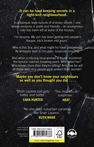 Details: ‘A masterful whodunnit, perfectly paced and expertly plotted, that had me guessing all the way through. I loved it and couldn't put it down.’ C L Taylor the gripping new thriller from the no. 1 bestselling author of the couple next door. ****** It can be hard keeping secrets in a tight-knit neighbourhood. In a tranquil, leafy suburb of ordinary streets – one where everyone is polite and friendly – An anonymous note has been left at some of the houses. ‘I’m so sorry. My son has been getting into people’s houses. He’s broken into yours.’ who is this boy, and what might he have uncovered? As whispers start to circulate, suspicion mounts. And when a missing local woman is found murdered, the tension reaches breaking point. Who killed her? Who knows more than they’re telling? And how far will all these very nice people go to protect their secrets? Maybe you don’t Know your neighbour as well as you thought you did... ****** 'no-one does suburban paranoia like Shari Lapena – This slowly unfurling nightmare will have you biting your nails until the end' Ruth Ware 'Shari Lapena just gets better and better' Cara hunter readers love Shari Lapena: 'twist on twist on twist on twist.' 'fantastic book, from the first page I was hooked, couldn't put it down!' 'The atmosphere that Lapena creates only adds to the amazing plot.' 'An excellent atmospheric thriller, full of intrigue and suspense.' 'I was reading with My mouth open as I raced towards the final page.' 'I read it in one sitting, as I simply could not put it down.' 'An incredibly gripping read.'.