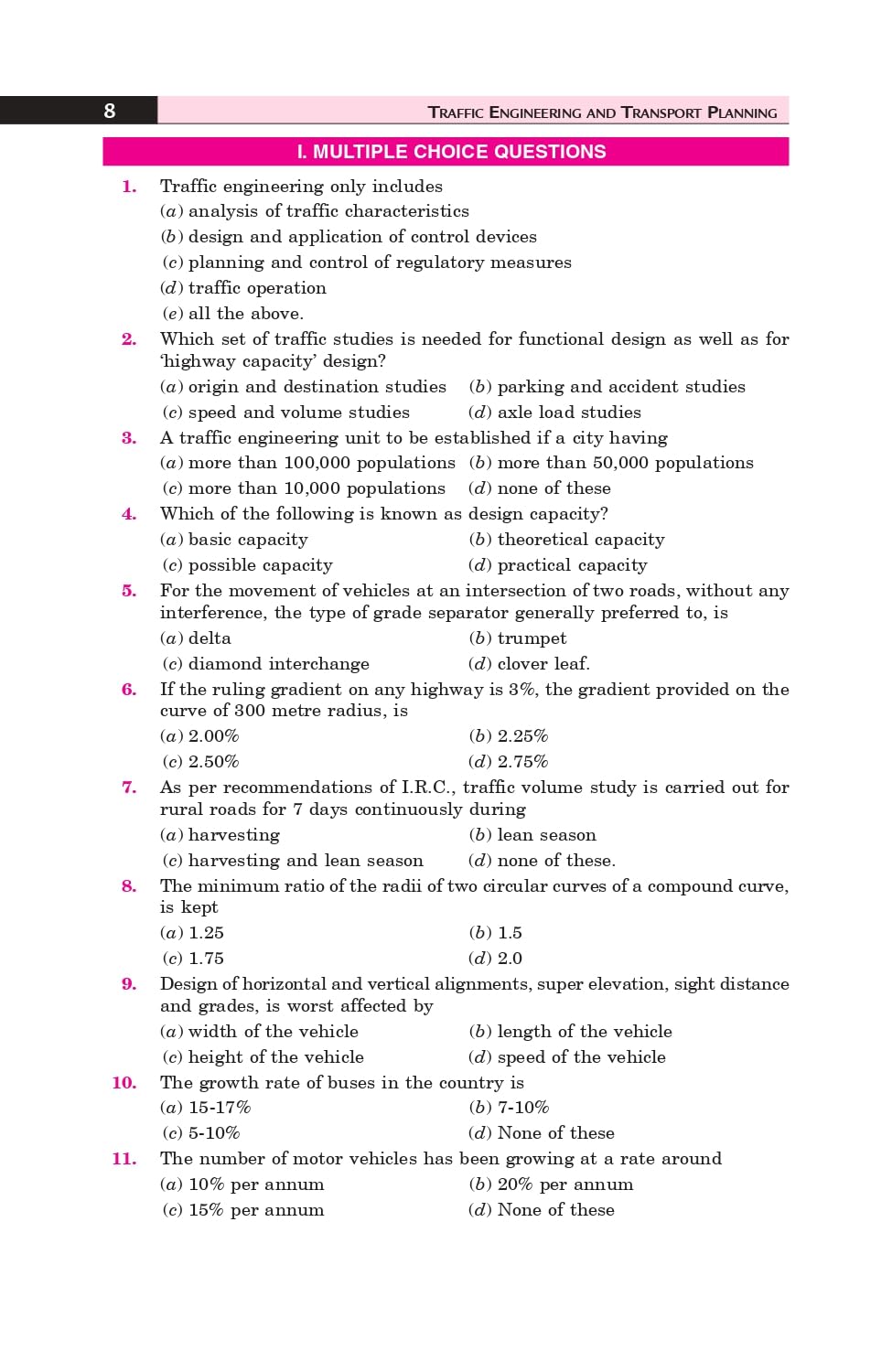Details: This subject is growing and its important as the vehicle population increases, and the attendant problems become alarming. Considering the relevance of the subject to our times is being offered to the undergraduate and post-graduate students in the discipline of Highway Engineering and Traffic Engineering, Professional Highway Engineers and Traffic Transportation Engineers and Town Planners in India. In fact, Traffic engineering has a multi-disciplinary coverage, and includes engineers, planners, statisticians, the police, administrators and so on. The book through its 51 Chapters covers following topics.