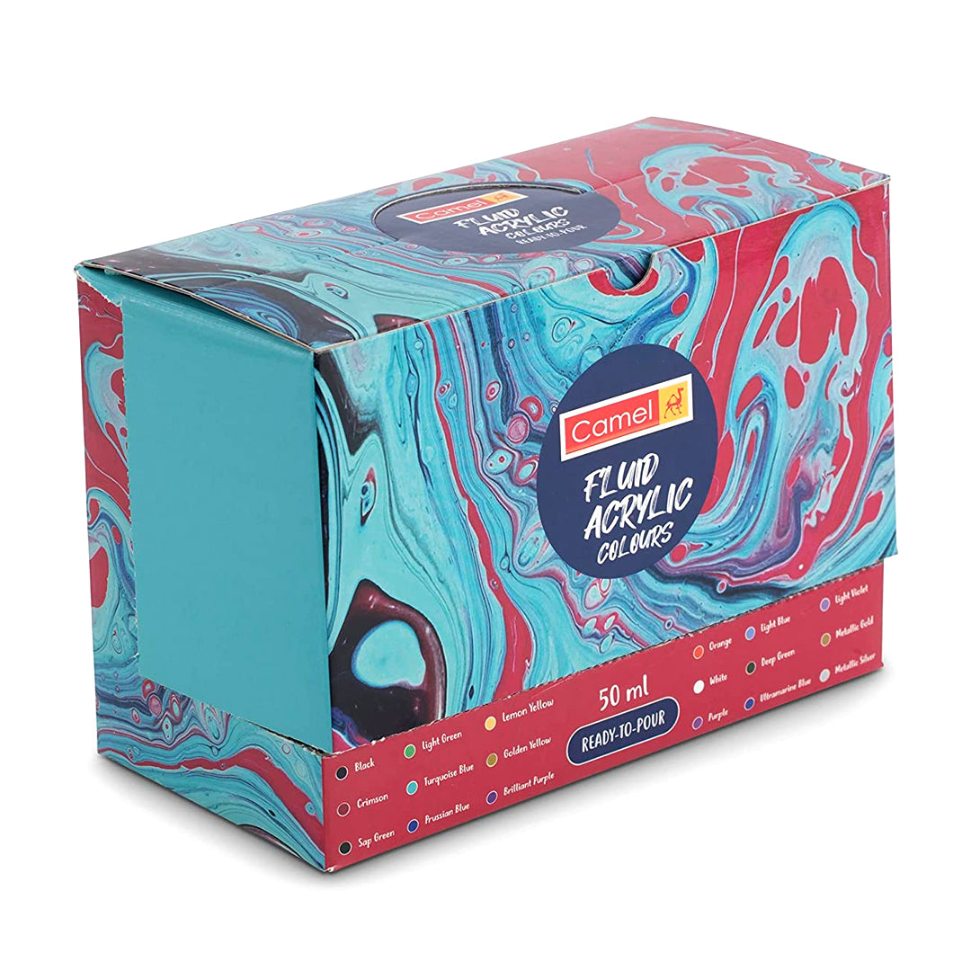 Camel Fluid Acrylic Colours Set of 18 Shades Pouring Ready Vibrant Fluid Paints for Art Canvas Craft and Mixed Media