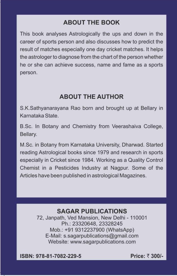 S.K. Sathyanarayana Rao was born and raised in Bellary, Karnataka. He holds a B.Sc. in Botany and Chemistry from Veerashaiva College, Bellary, and an M.Sc. in Botany from Karnataka University, Dharwad. Rao began studying astrology in 1979 and has conducted extensive research on sports astrology, particularly cricket, since 1984. He currently works as a Quality Control Chemist in a pesticides industry in Nagpur. His articles have been featured in several astrological magazines.