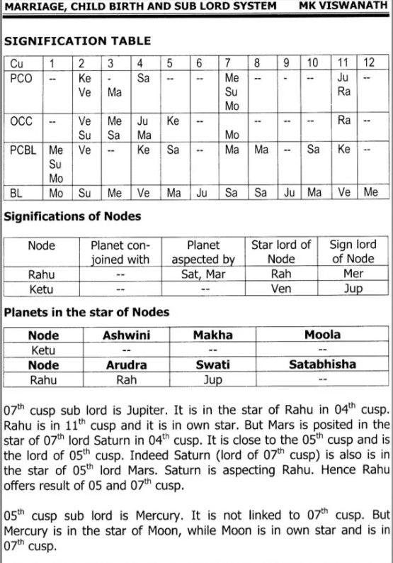 - In addition to the **7th house** (marriage) and **5th house** (children), the book provides insight into other important houses in the horoscope and how their sub-lords influence marital life and childbirth. For example: