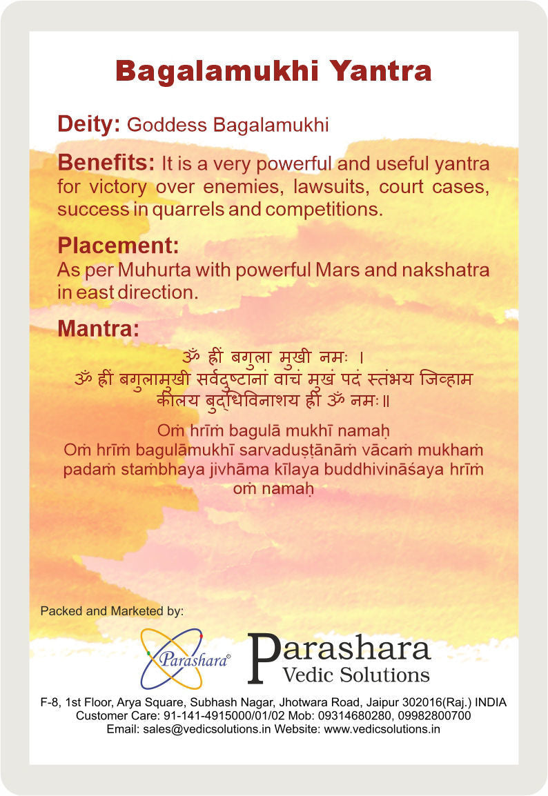 • Charges the yantra with occult forces through the blessings of Goddess Bagalamukhi