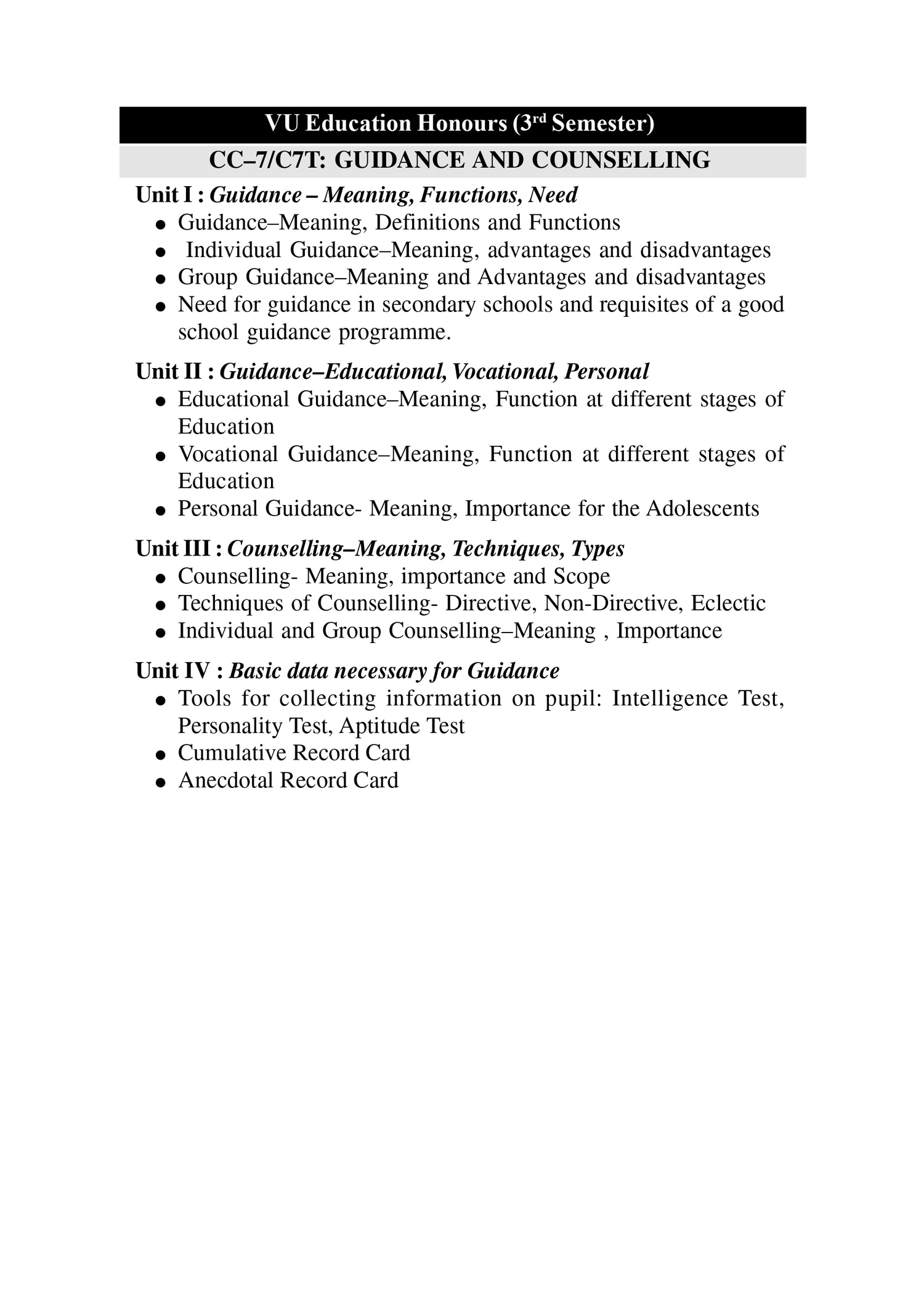 Unit I : Guidance – Meaning, Functions, Need
