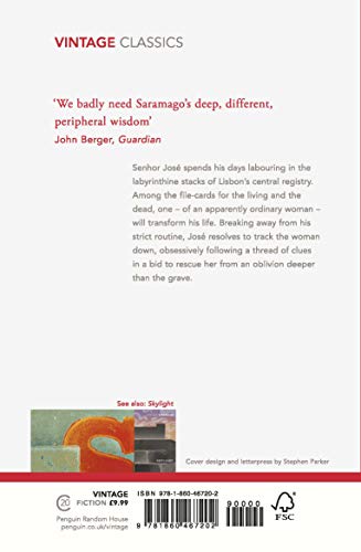 Senhor José is a lonely civil servant who spends his days labouring in the labyrinthine stacks of Lisbon's central registry. Among the file-cards for the living and the dead, one – of an apparently ordinary woman – will transform his life. Breaking away from his strict routine, José resolves to track the woman down, obsessively following a thread of clues in a bid to rescue her from an oblivion deeper than the grave.
