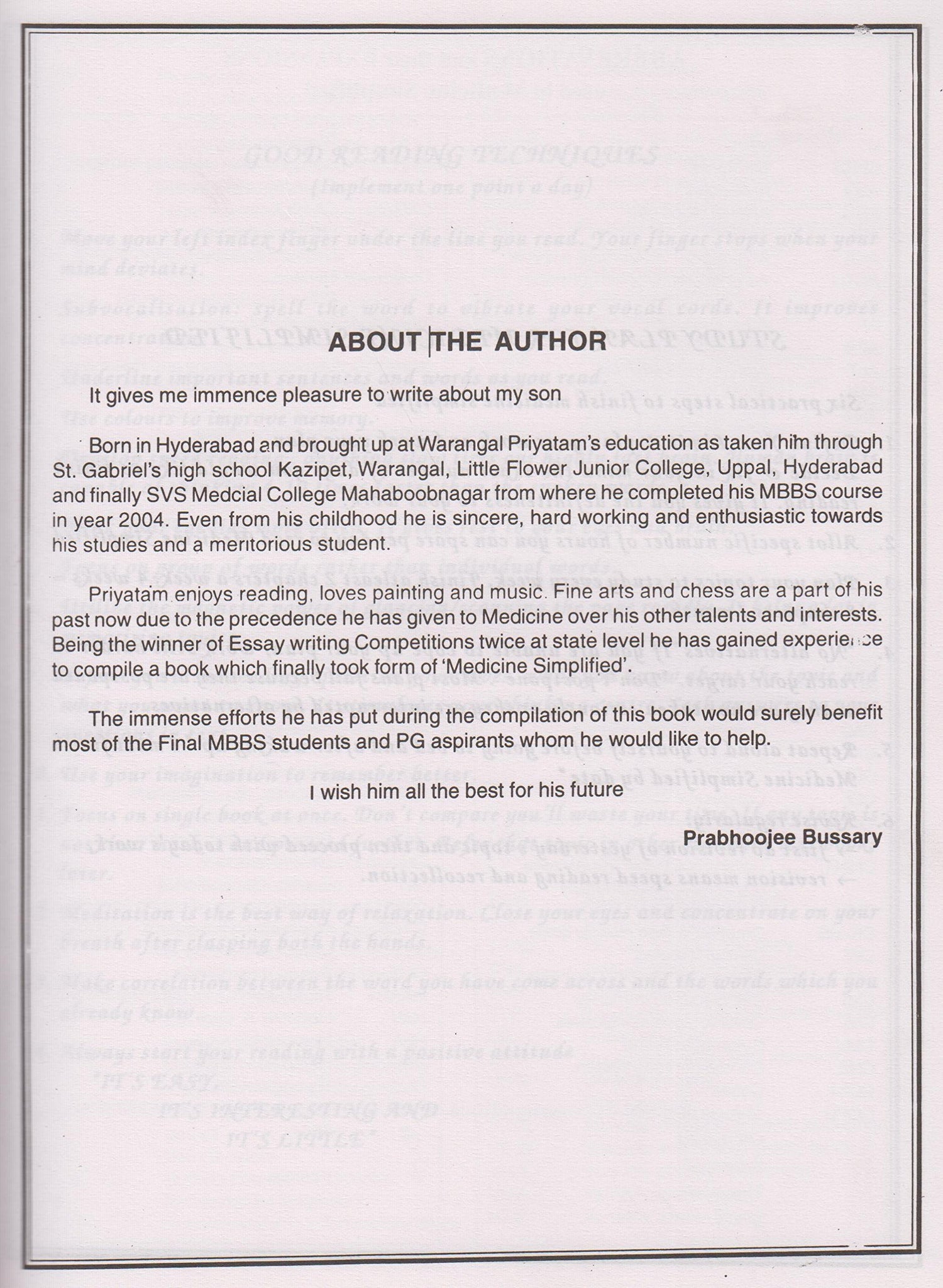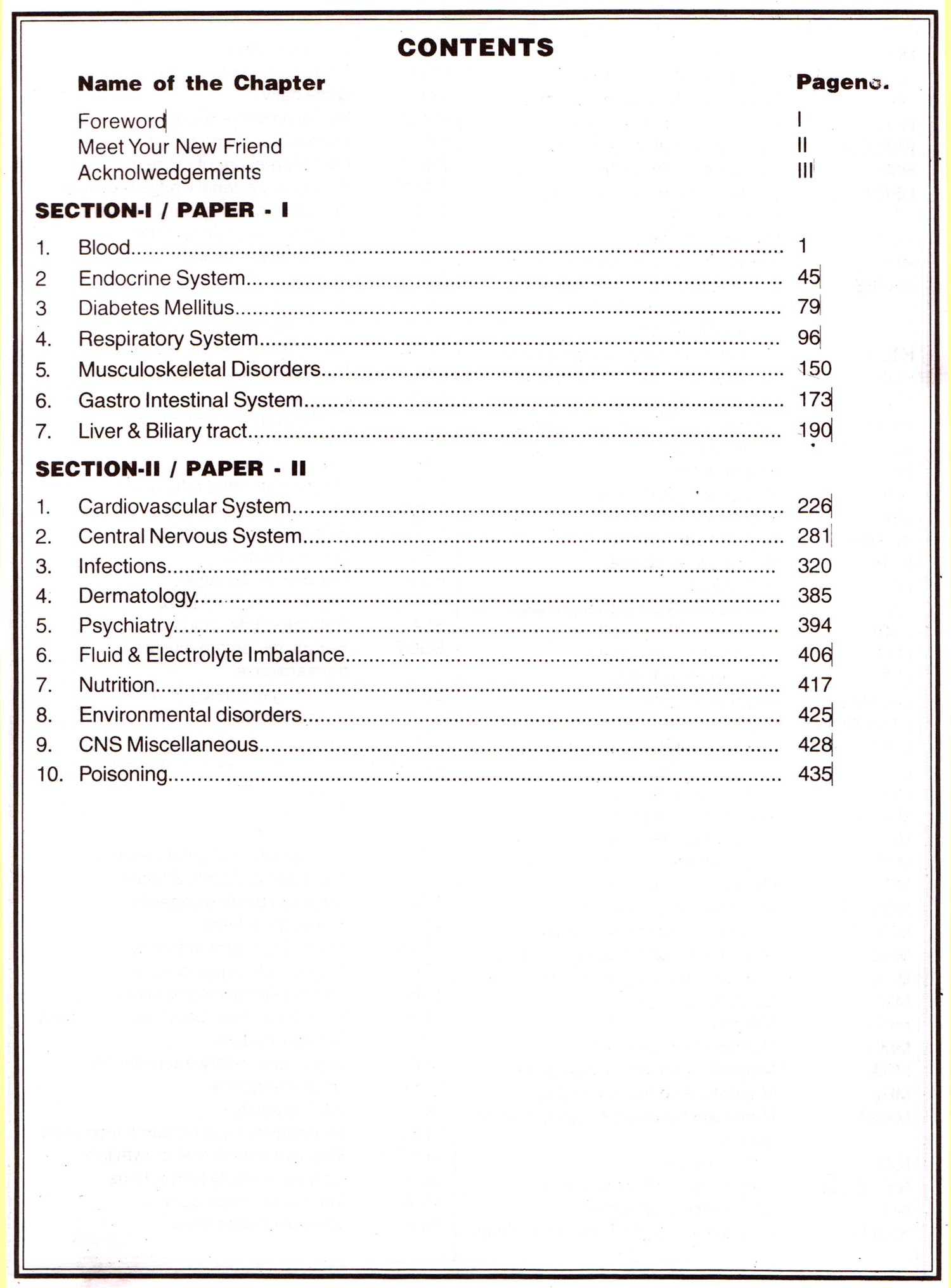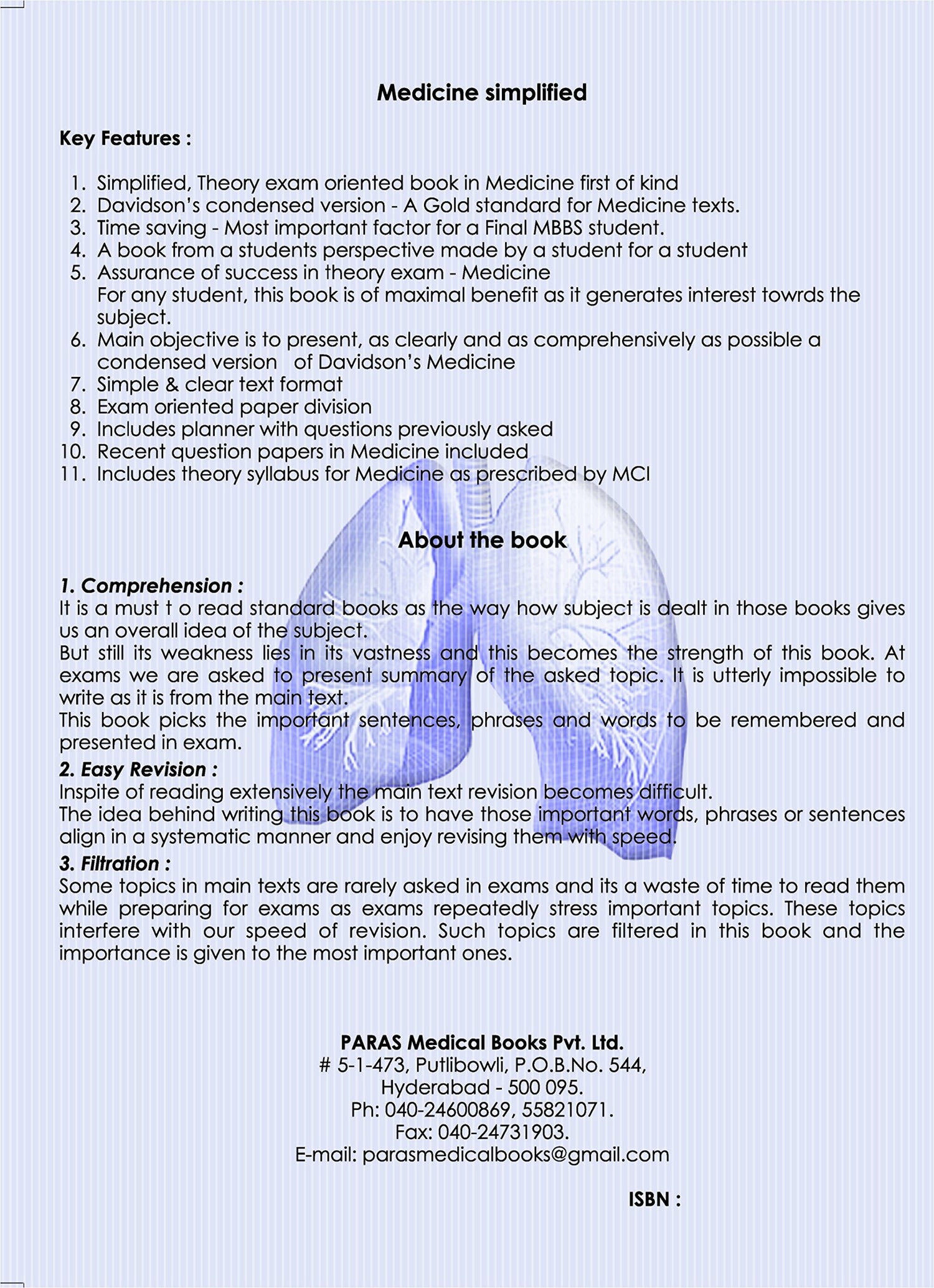 Details: About the book: 1. Comprehension: It is a must t o read standard books as the way how subject is dealt in those books gives us an overall idea of the subject. But still its weakness lies in its vastness and this "the becomes the asked topic. strength of this book. At It is utterly impossible to exams we are asked to present summary of write as it is from the main text. This book picks the important sentences, phrases and words to be remembered and presented in exam. 2. Easy Revision: In spite of reading extensively the main text revision becomes difficult. The idea behind writing this book is to have those important words, phrases or sentences align in a systematic manner and enjoy revising them with speed. 3. Filtration: Some topics in main texts are rarely asked in exams and its a waste of time to read them while preparing for exams as exams interfere with our speed of revision repeatedly stress important topics. These topics Such topics are filtered in this book and the importance is given to the most important ones. Key Features: 1. Simplified, Theory exam oriented book in Medicine first of kind 2. Davidson's condensed version - A Gold standard for Medicine texts. 3. Time saving - Most important factor for a Final MBBS student. 4. A book from a students perspective made by a student for a student 5. Assurance of success in theory exam - Medicine For any student, this book is of maximal benefit as it generates interest towrds the subject. 6. Main objective is to present, as clearly and as comprehensively as possible a condensed version of Davidson's Medicine 7. Simple & clear text format 8. Exam oriented paper division 9. Includes planner with questions previously asked 10. Recent question papers in Medicine included 11. Includes theory syllabus for Medicine as prescribed by MCI