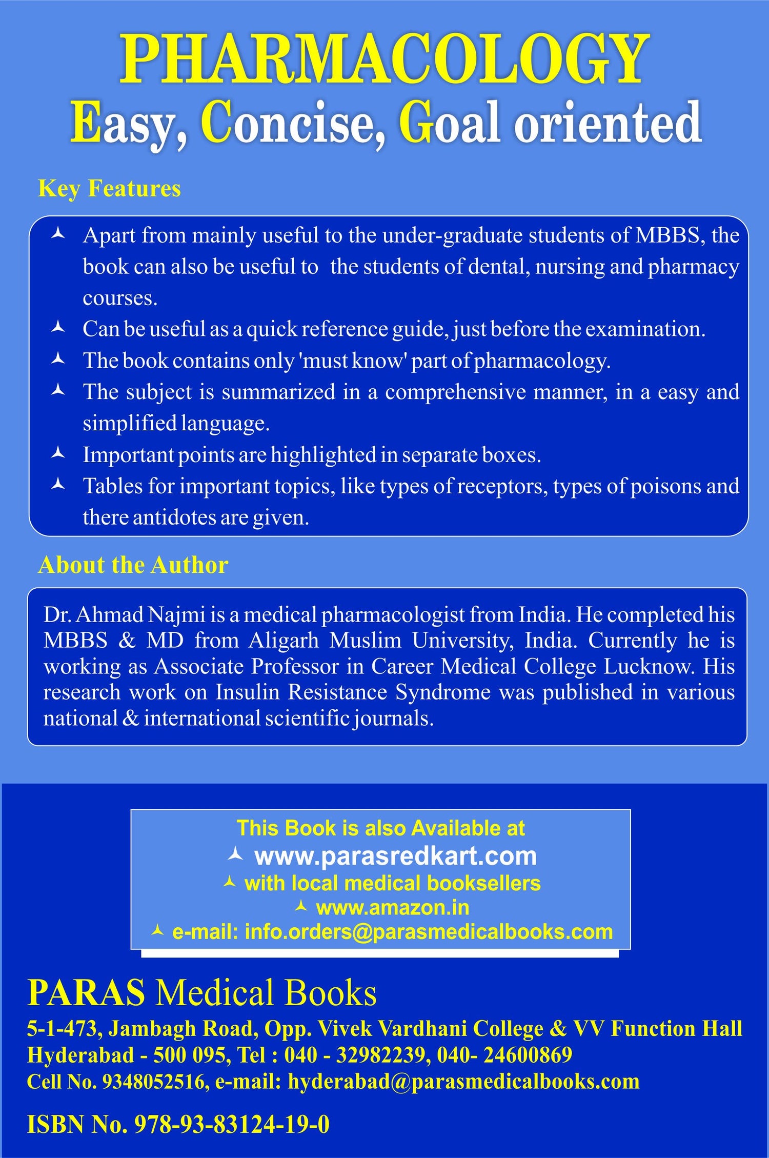 Details: About the Author: Dr. Ahmad Najmi is a medical pharmacologist from India. He completed his MBBS & MD from Aligarh Muslim University, India. Currently he is working as Associate Professor in Career Medical College Lucknow. His research work on Insulin Resistance Syndrome was published in various national & international scientific journals. Key Features: Apart from mainly useful to the under-graduate students of MBBS, the book can also be useful to the students of dental, nursing and pharmacy courses. Can be useful as a quick reference guide, just before the examination. The book contains only 'must know' part of pharmacology. The subject is summarized in a comprehensive manner, in a easy and simplified language. Important points are highlighted in separate boxes. Tables for important topics, like types of receptors, types of poisons and there antidotes are given.